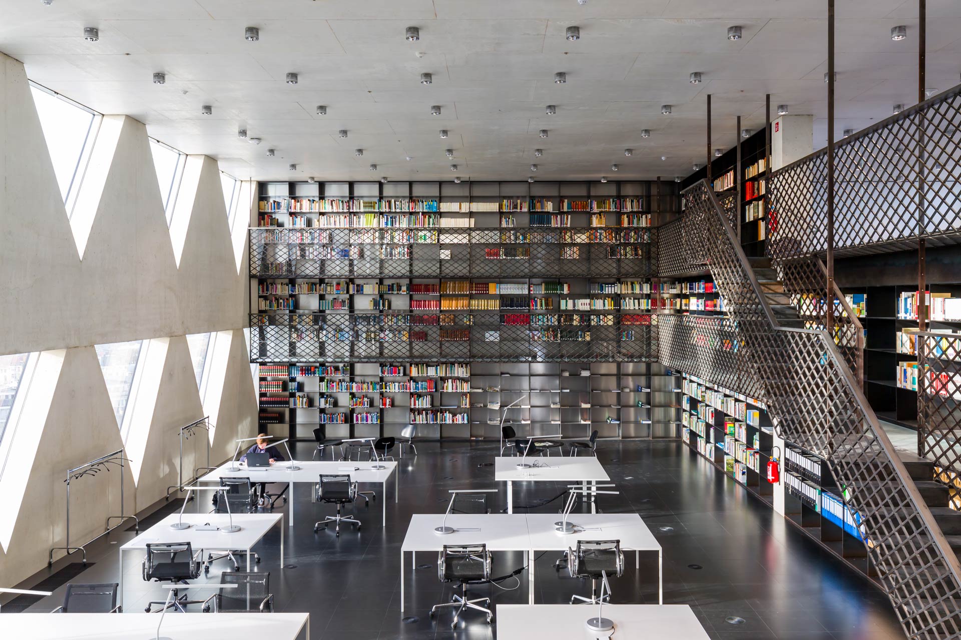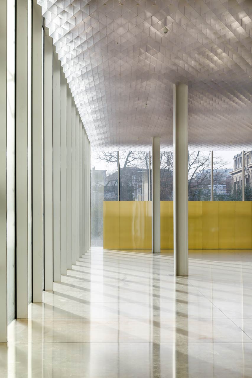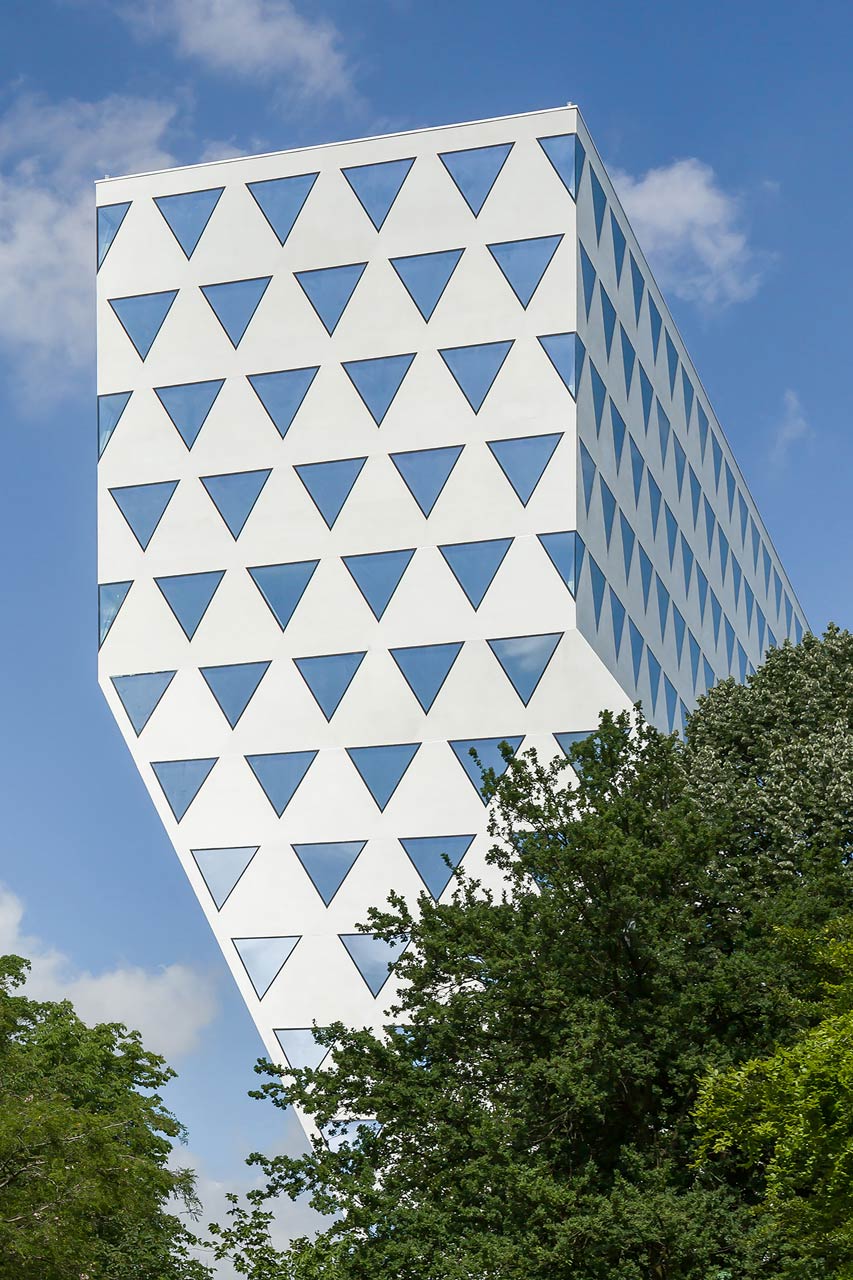 Das neue Gebäude ist als Brückenkonstruktion konzipiert. In der Mitte des Plans spannt ein großer Stahlfachwerkträger von einem Kern zum anderen. Durch die Drehung des Grundrisses um eine seiner Ecken verschiebt sich das Gebäude mit dem Aufstieg in die Höhe zur Mitte hin und bildet eine skulpturale Form. Binder, integriert in die Betonseitenwände, geben durch ihre Triangulation die Form der Fensteröffnungen vor. Die hohen dreieckigen Fenster, im ganzen Gebäude angewandt, erweisen sich als sehr effizient, bringen viel Tageslicht an die Decke und damit weit in die Tiefe des Raumes. Die opake Fassade ist mit rundem, weißem Glasmosaik verkleidet. Nur rund 40 % der Fassade bestehen dabei aus Glas, günstig für die Energieeffizienz. Der sommerliche Wärmeschutz ist durch eine Sonnenschutzbeschichtung und einen halbtransparenten innenliegenden Sonnenschutz sichergestellt.