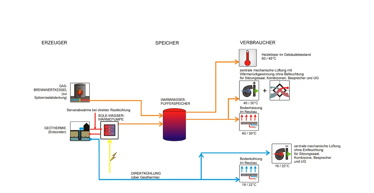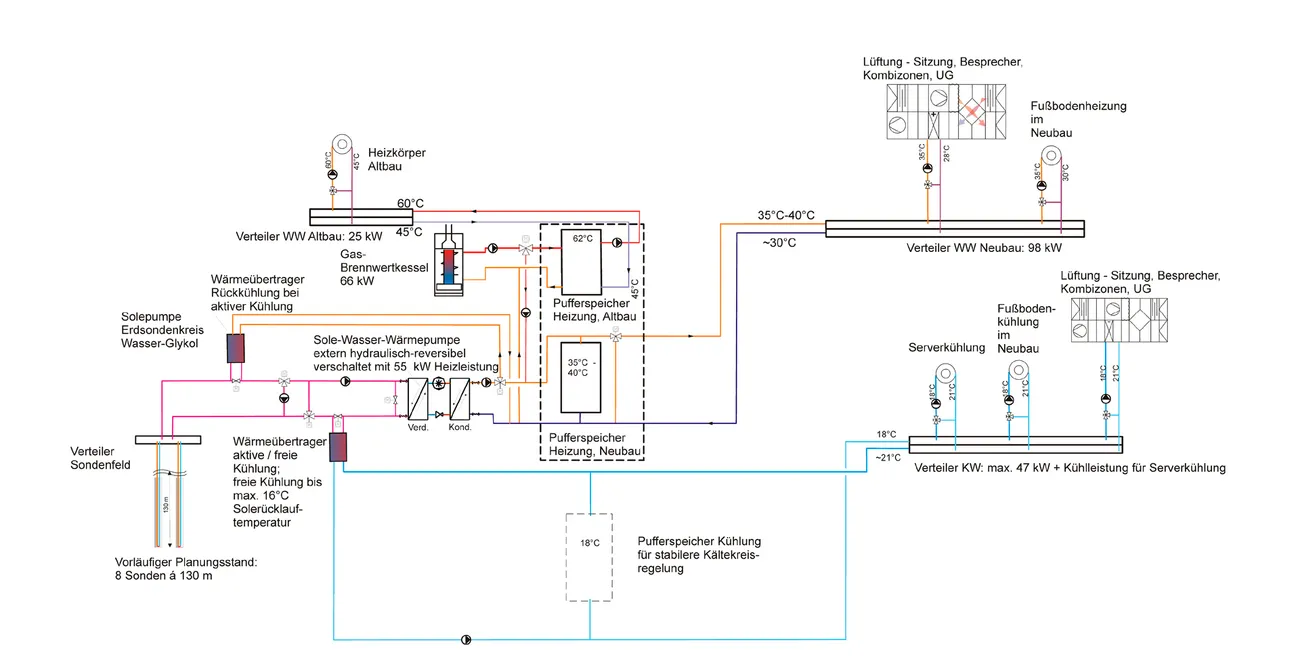 Acht linear angeordnete Sonden mit je 130 m Länge sind mit einer reversibel verschalteten Sole-Wasser-Wärmepumpe kombiniert und decken den Wärme- und Kältebedarf des Neubaus ab. Im Wärmeverbund mit dem Altbau deckt der dort befindliche Gasbrennwertkessel Spitzenlasten im Heizbedarf ab.