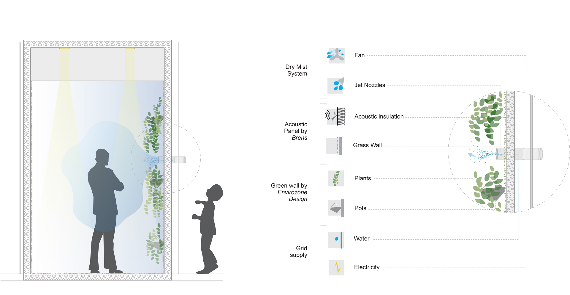 Das gesamte Konzept erfordert keine mechanische Kühlung. Auf innovativen, zu 100% aus recyceltem Material bestehenden Akustikabsorbern wachsen Pflanzen, was die akustischen Eigenschaften des Raumes verändert. Die Trockennebelventilatoren sorgen für Luftbewegung und Verdunstungskühlung, die Lufttemperatur sinkt und gleichzeitig steigt die Luftfeuchtigkeit. Es ist ein kniffliger Balanceakt, Umgebung, Material und Licht durch passive Systeme so zu beeinflussen, dass die menschliche Empfindung ausgetrickst wird und dieser Wahrnehmungsraum entsteht, der es erlaubt, die Ausstellung einige Augenblicke lang gefühlt zu verlassen.