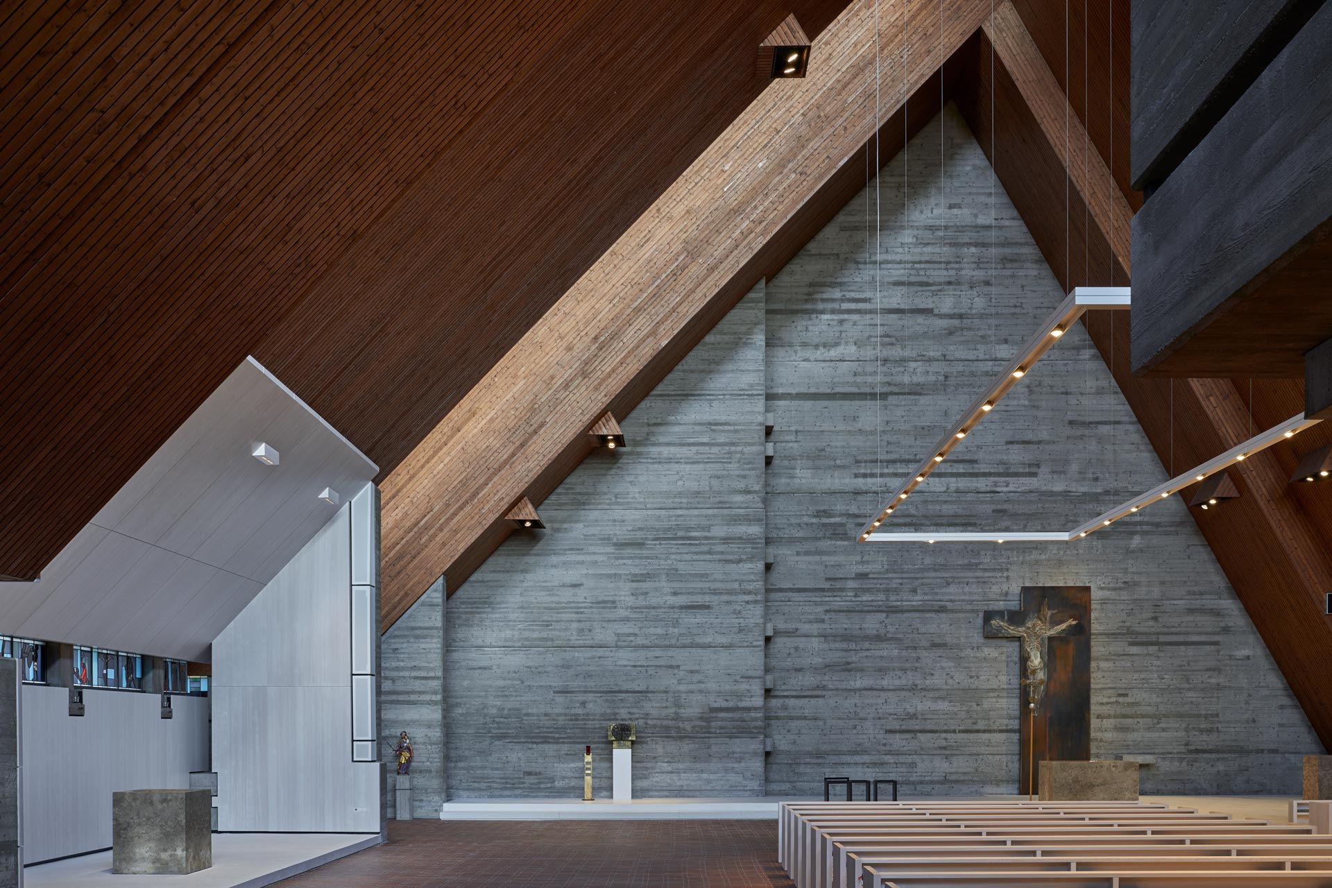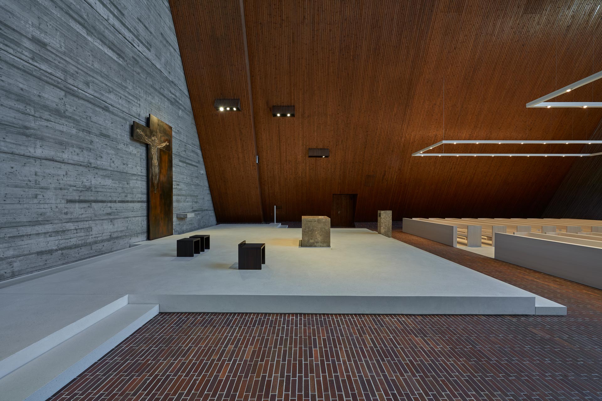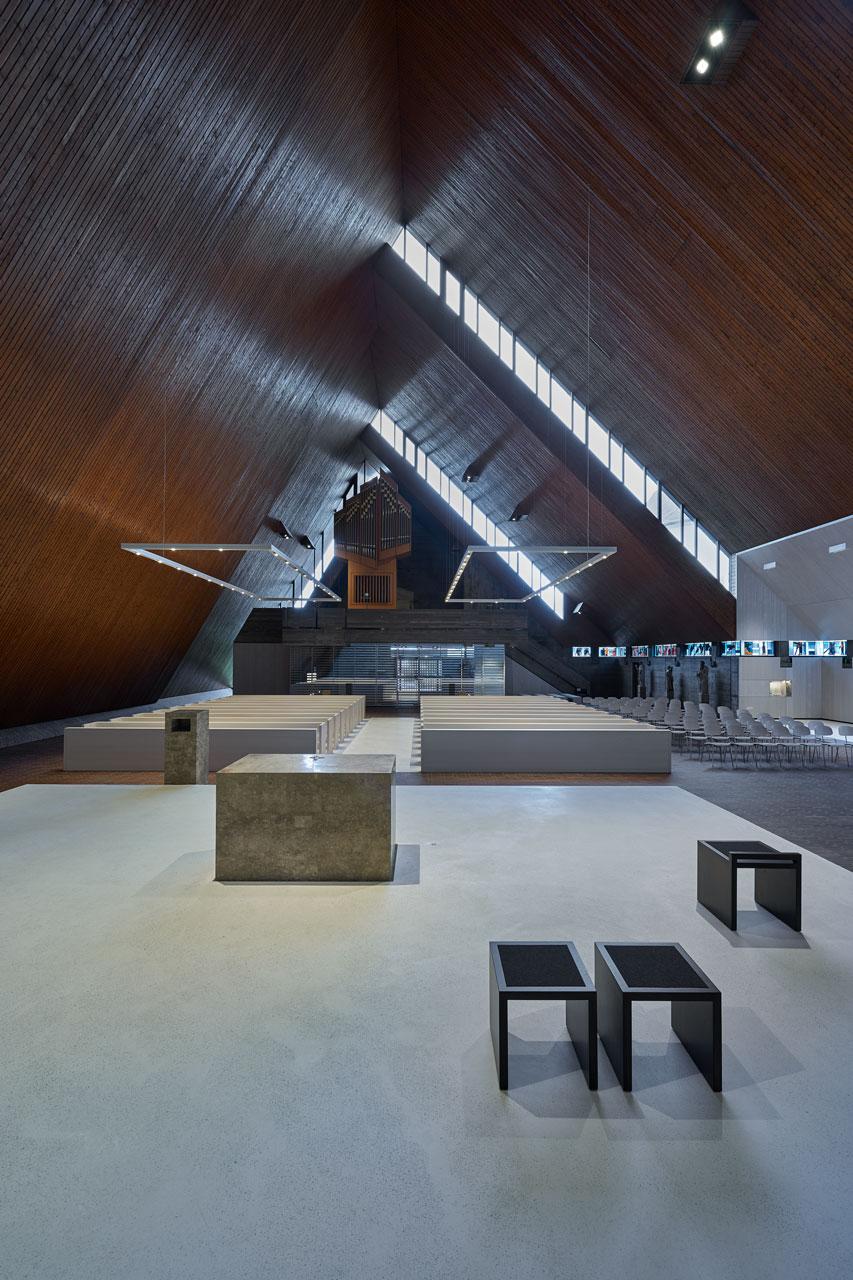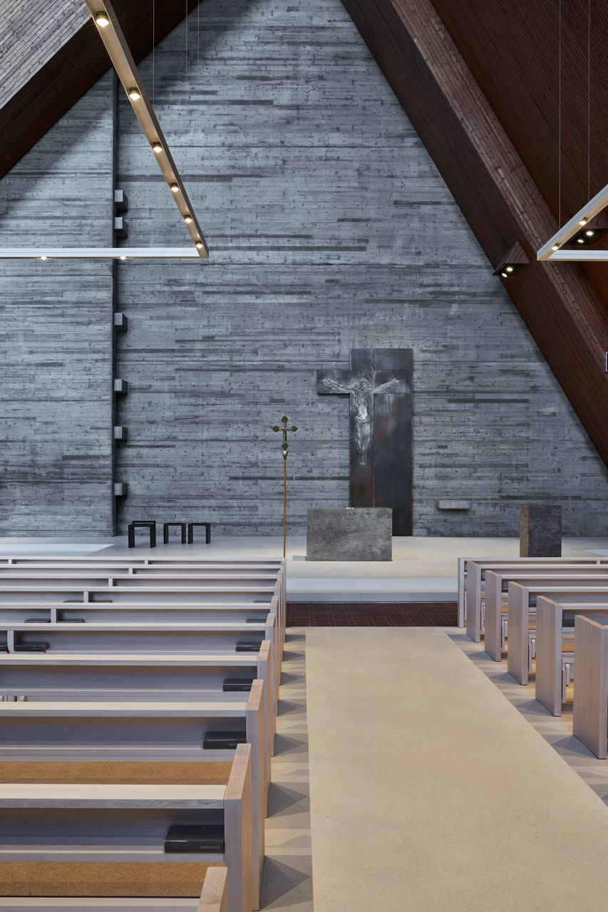 Eine Gesamtsanierung kam aus Kostengründen nicht in Frage, das Nutzungsprofil einer Kirche entspricht ja auch nicht dem eines Wohnhauses. Deshalb wurde eine gezielte Beheizung nur der Bereiche angestrebt, an denen sich Personen aufhalten. Also musste die oberste Schicht im Boden, die alten Backsteine, weichen und Platz machen für eine Dämmung nach unten und für die moderne Fußbodenheizung im Estrich des benutzten Bereichs, der Gemeindeinsel, also dort, wo die Kirchenbänke stehen: bedarfsgerecht. Darüber liegt nun ein heller Terrazzo-Belag, der gut mit der neuen Strahlungswärme harmoniert. Sollte es im Winter doch einmal kalt werden, dann lassen sich die Kirchenbänke selbst noch zusätzlich elektrisch beheizen; Heizkörper sollten auf jeden Fall nicht eingebaut werden.