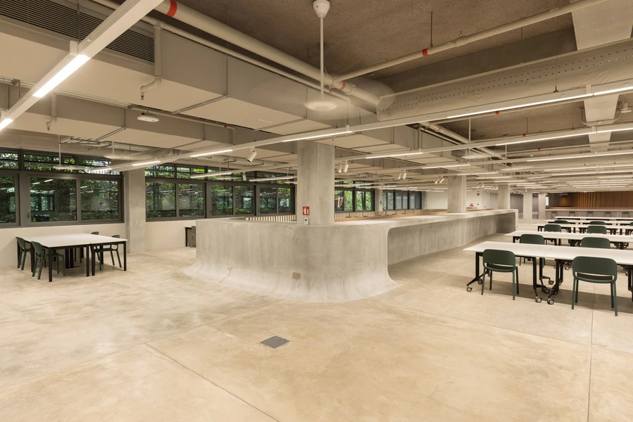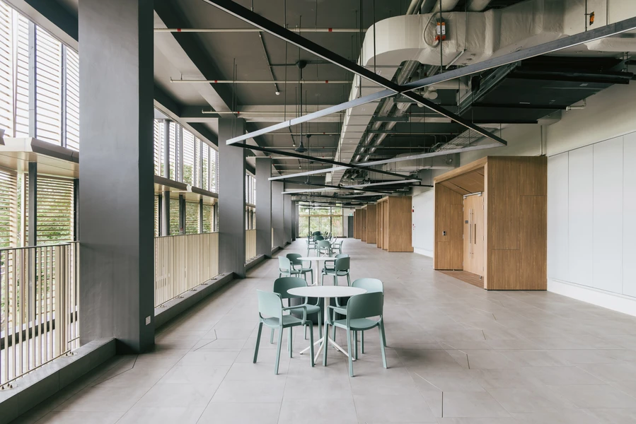 Die Anordnung und Abfolge der thermischen Zonen in den verschiedenen Programmbereichen wurde entsprechend ihrer jeweiligen Anforderungen organisiert. Viele Bereiche wurden bewusst als Außenbereiche konzipiert, die vor Wind, Regen und Blendung geschützt sind, aber auch über viel Tageslicht und eine beste natürliche Belüftung verfügen. Für große Nutzungsbereiche gelten nun erweiterte Temperatur- und Feuchtigkeitsbereiche, was mit hybrider Kühlung erzielt wird, d. h. einer Kombination aus Deckenventilatoren und einem reinen Frischluftsystem. Die leicht erhöhten Raumlufttemperaturen führen zu geringeren Unterschieden zwischen innen und außen. Dies ermöglicht einen problemlosen Übergang von einer temperierten mechanischen Luftzufuhr zu natürlicher Belüftung. Der Ansatz unterstreicht die Rolle der Gestaltung von Fassaden und der thermischen Zonierung von tropischen Gebäuden zugunsten einer natürlichen Belüftung und dem damit verbundenen Potential für erhebliche Energieeinsparung und Minderung von CO2-Emissionen.