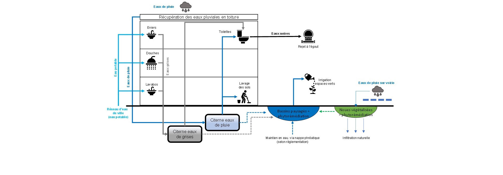 Neben ihren klimatischen Vorteilen spielen die Gewässer eine zentrale Rolle bei der Wasserwirtschaft. Das auf den Dächern der Gebäude gesammelte Regenwasser wird in Zisternen gespeichert und wiederverwendet. Der Überlauf fließt in die Gewässer, die auch das gereinigte Straßenwasser auffangen, nachdem es durch begrünte Mulden geleitet wurde, die für Phytosanierung sorgen.