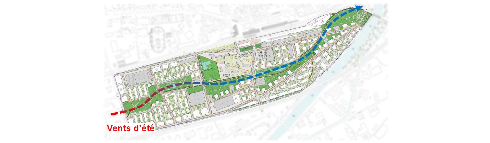 Transsolar hat sich dem Gewinnerteam Herzog De Meuron und Michel Desvignes Paysagistes angeschlossen, um ein ganzheitliches Umweltkonzept in den Leitplan aufzunehmen, das die wichtigsten Aspekte der Nachhaltigkeit umfasst, von der «Makroebene» – dem Gesamtgrundriss – bis zur «Mikroebene» – der Wohneinheit.