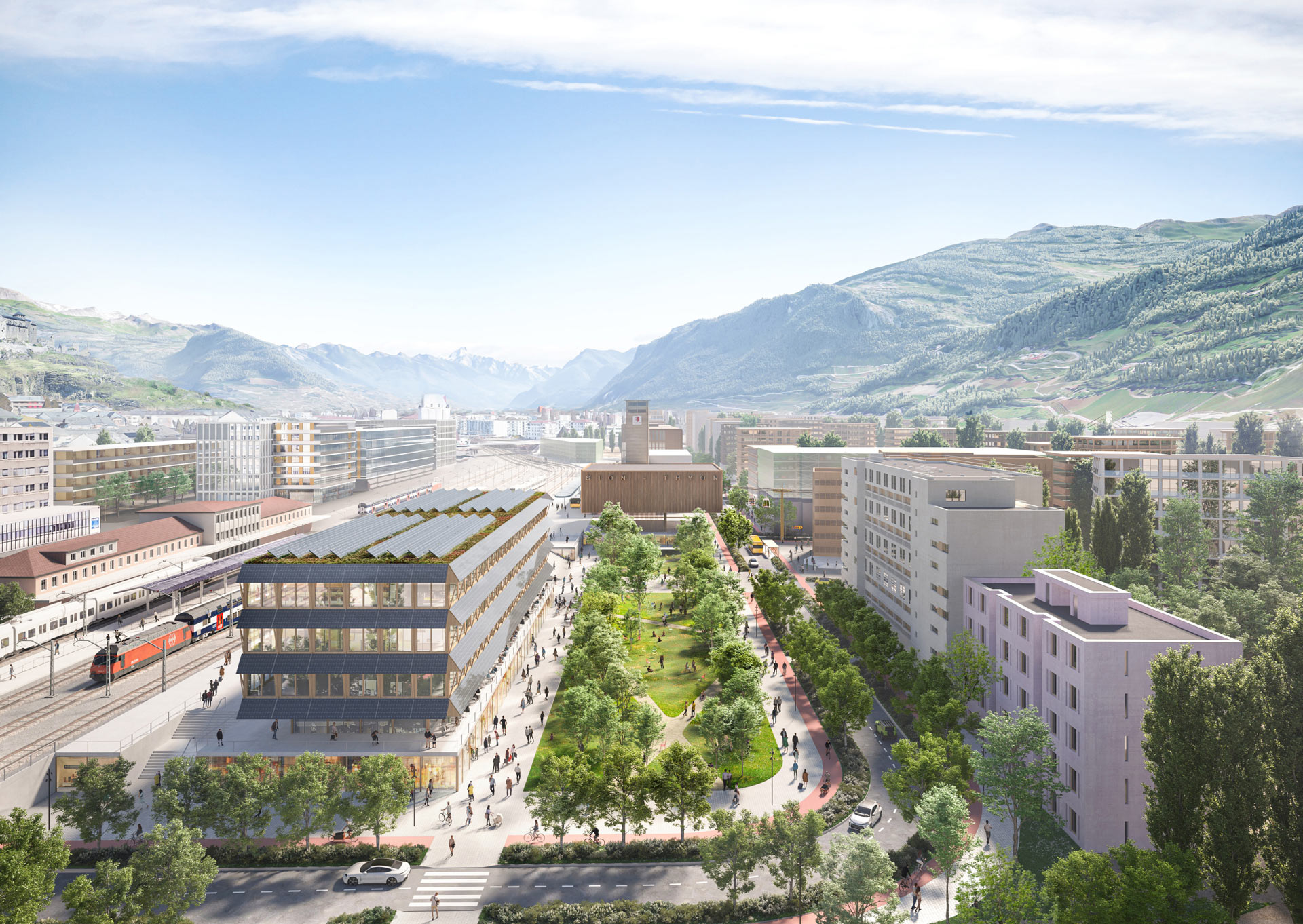 Die Stadt Sitten (franz. Sion) im Südwesten des Kantons Wallis hat 2019 einen internationalen Wettbewerb ausgeschrieben, um einen Leitplan für das Quartier Ronquoz zu entwickeln. Dieses Viertel liegt eingebettet im Herzen des Tals und bietet aufgrund seiner Nähe zu Einrichtungen, Verkehrsachsen (Bahnhof und Autobahnanschluss) und der Rhône, deren Ufer neugestaltet werden sollen, eine ideale Lage. Die Herausforderung für dieses weitläufige, mehr als 60 Hektar große Gebiet, das derzeit hauptsächlich industriell genutzt wird, besteht darin, die Landschaft der Stadt wieder in den Mittelpunkt der territorialen Entwicklung zu rücken und es in den nächsten dreißig Jahren zu einem Stadtteil der Zukunft zu machen, in dem man wohnt, arbeitet, lernt oder sich entspannt.
