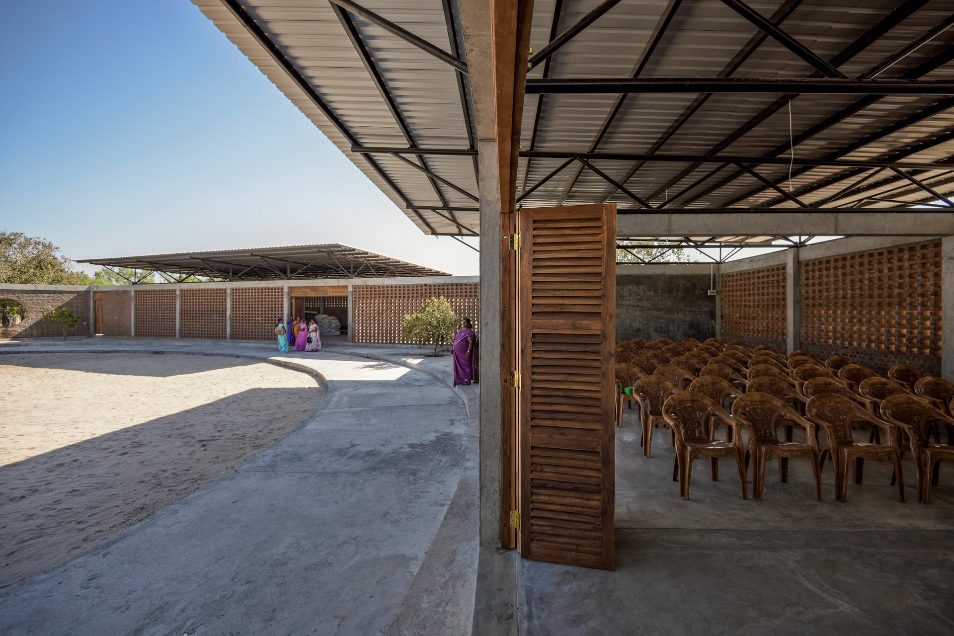 Die Pavilions nutzen gezielt die bestehenden Bäume als Schattenspender. Auch die weit auskragenden Dächer verschatten Innenraum und Wände. Die Räume vermeiden Hitzestau durch den Abstand zwischen Baukörpern und Dächern. Deren Aluminiumsheets reflektieren zudem einen Teil der Sonnenenergie und minimieren das Abstrahlen der Wärme durch Ihre low-e Oberflächeneigenschaft. Das spendenfinanzierte Budget erlaubt keine verglasten Fenster, daher sind die perforierten Mauern eine gute Lösung, denn sie ermöglichen so erst die Nutzung des Gebäudes in den heißen Sommermonaten: Der meist wehende leichte Wind zieht unterhalb der Dächer und durch die perforierten Mauern und führt die Wärme ab. Schiebefaltwände aus Holz ermöglichen das Konzept der flexiblen Mehrfachnutzung der Räume .