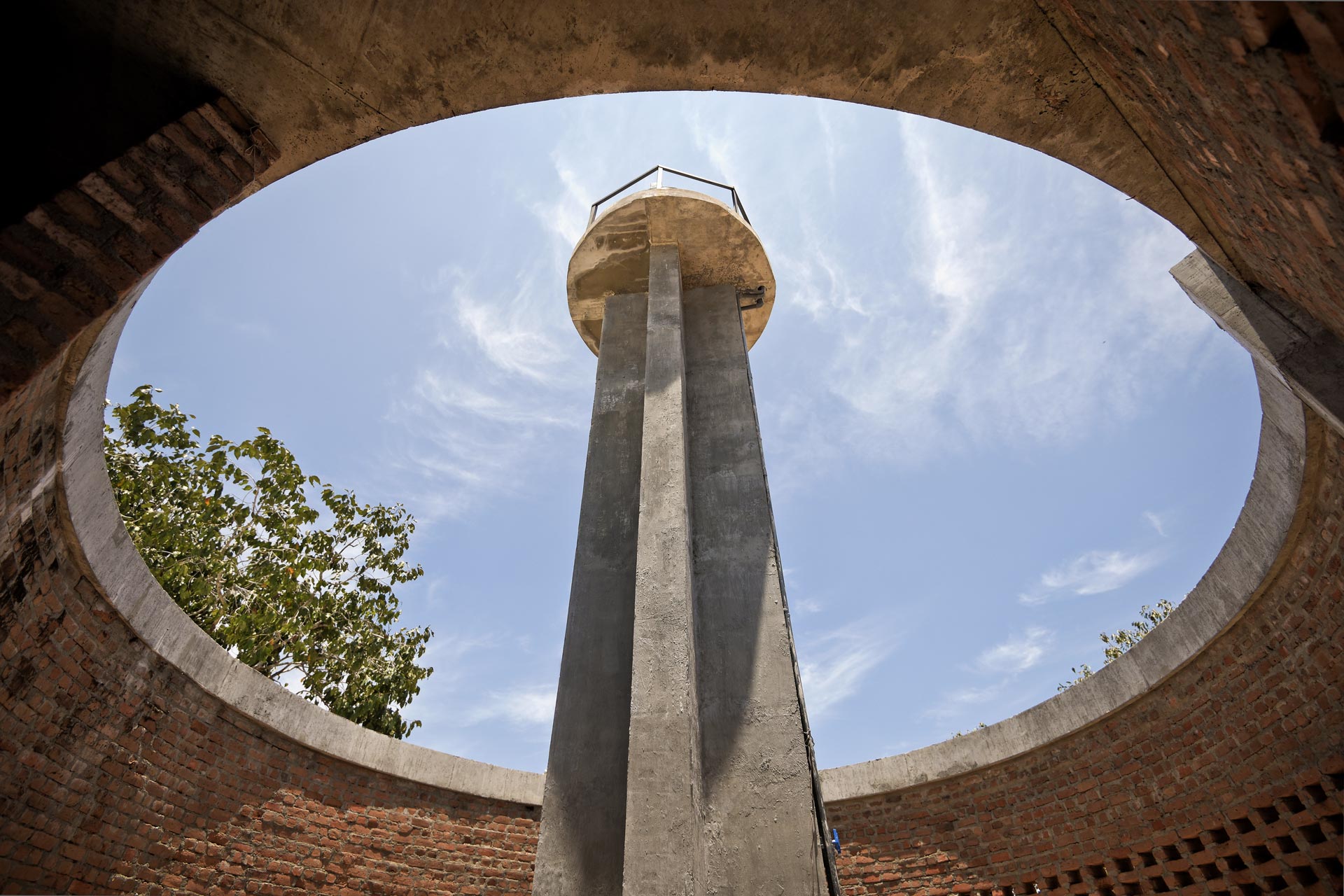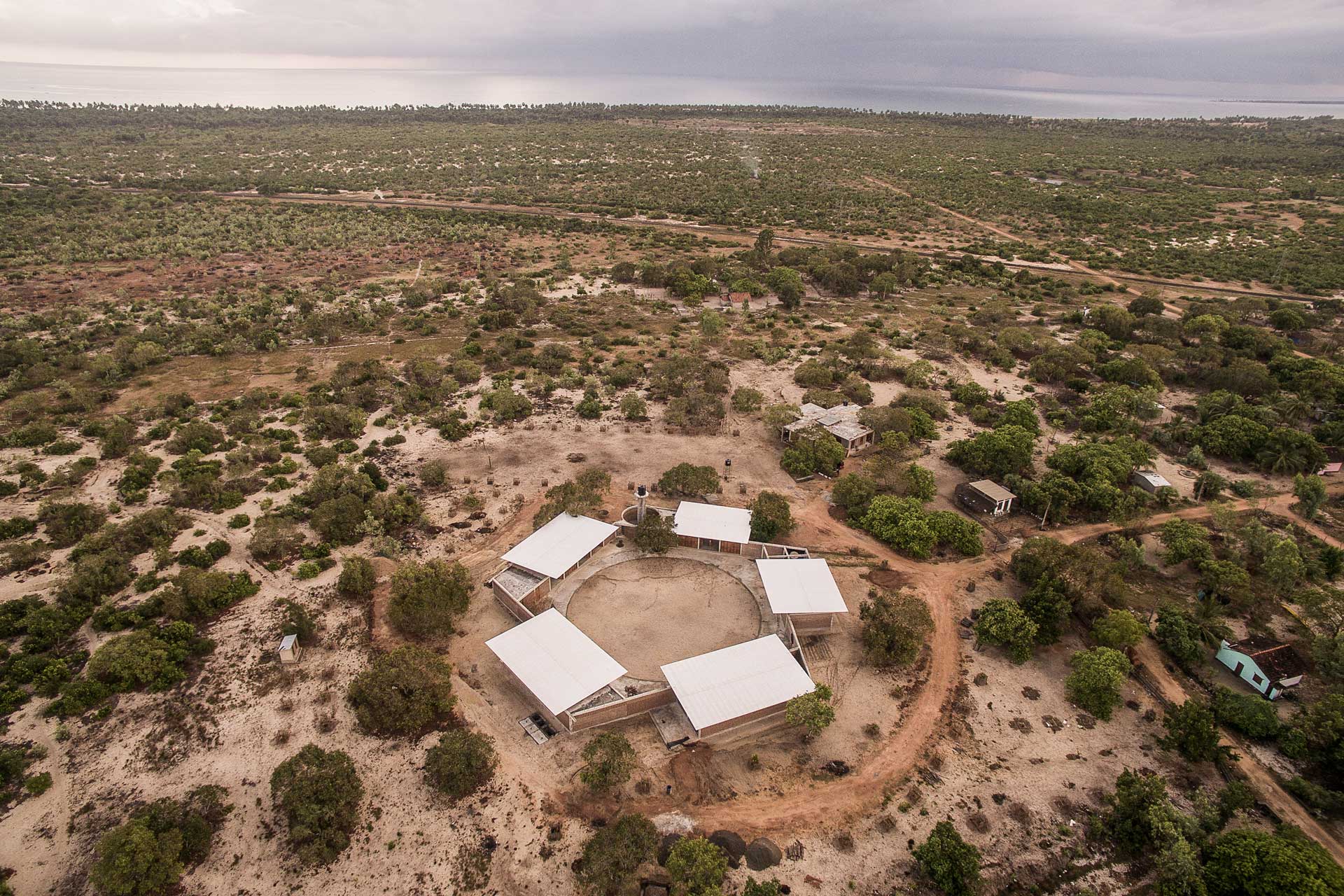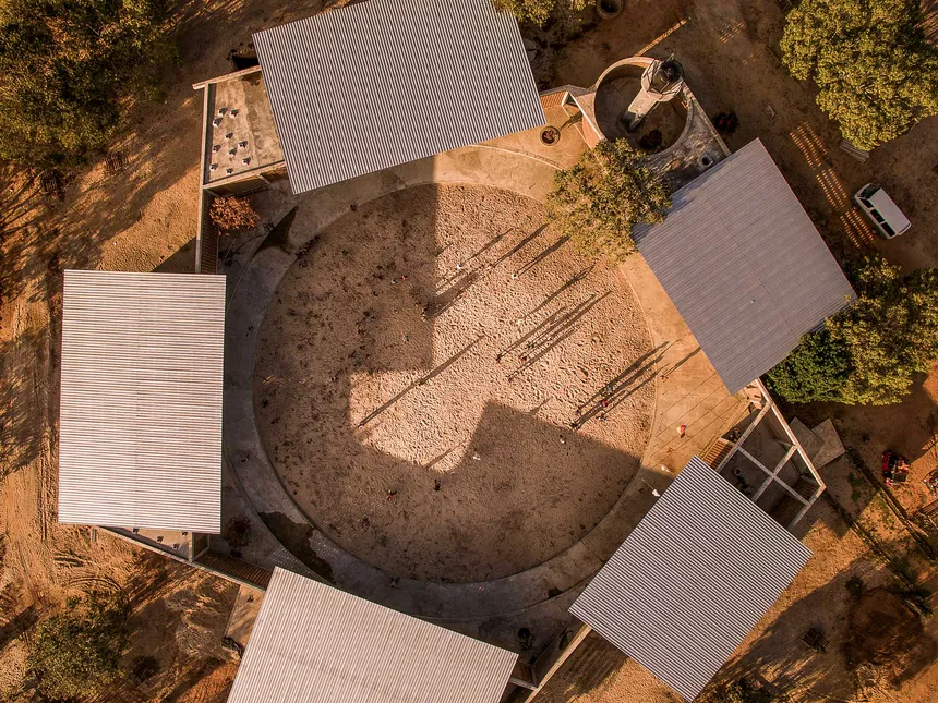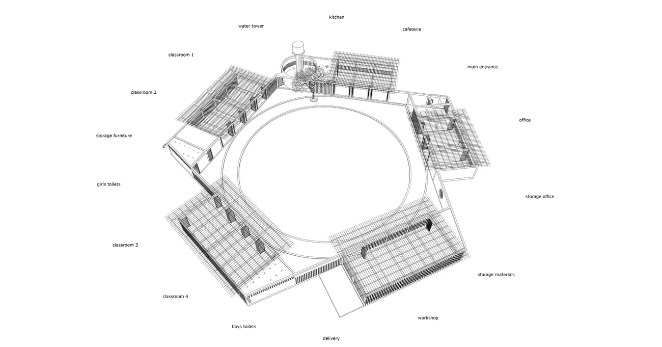 Es galt die wenigen höheren Bäume als wertvolle Schattenspender zu auf dem Grundstück zu bewahren. So sind die Bäume nun von fünf Pavilions umgeben und schaffen mit einer perforierten Mauer den zentralen Innenhof. Zum Schutz vor Überflutung und Sandverwehungen sitzen die Gebäude auf einem Sockel. Die Anlage besteht aus zwei großen multifunktionalen Klassenzimmern, einer Küche mit Cafeteria, Werkstätten, Lager, einem Wasserturm und der Verwaltung sowie WCs. Sport- und Kinderspielplatz liegen im Außenbereich. Die weit auskragenden Dächer spenden Schatten und schützen vor Regen, sperren Wind jedoch nicht aus.