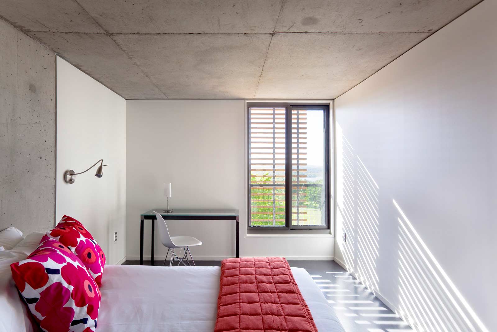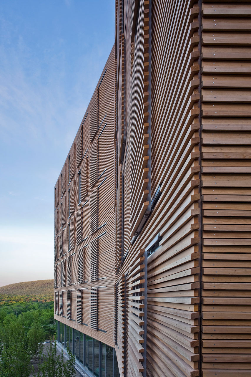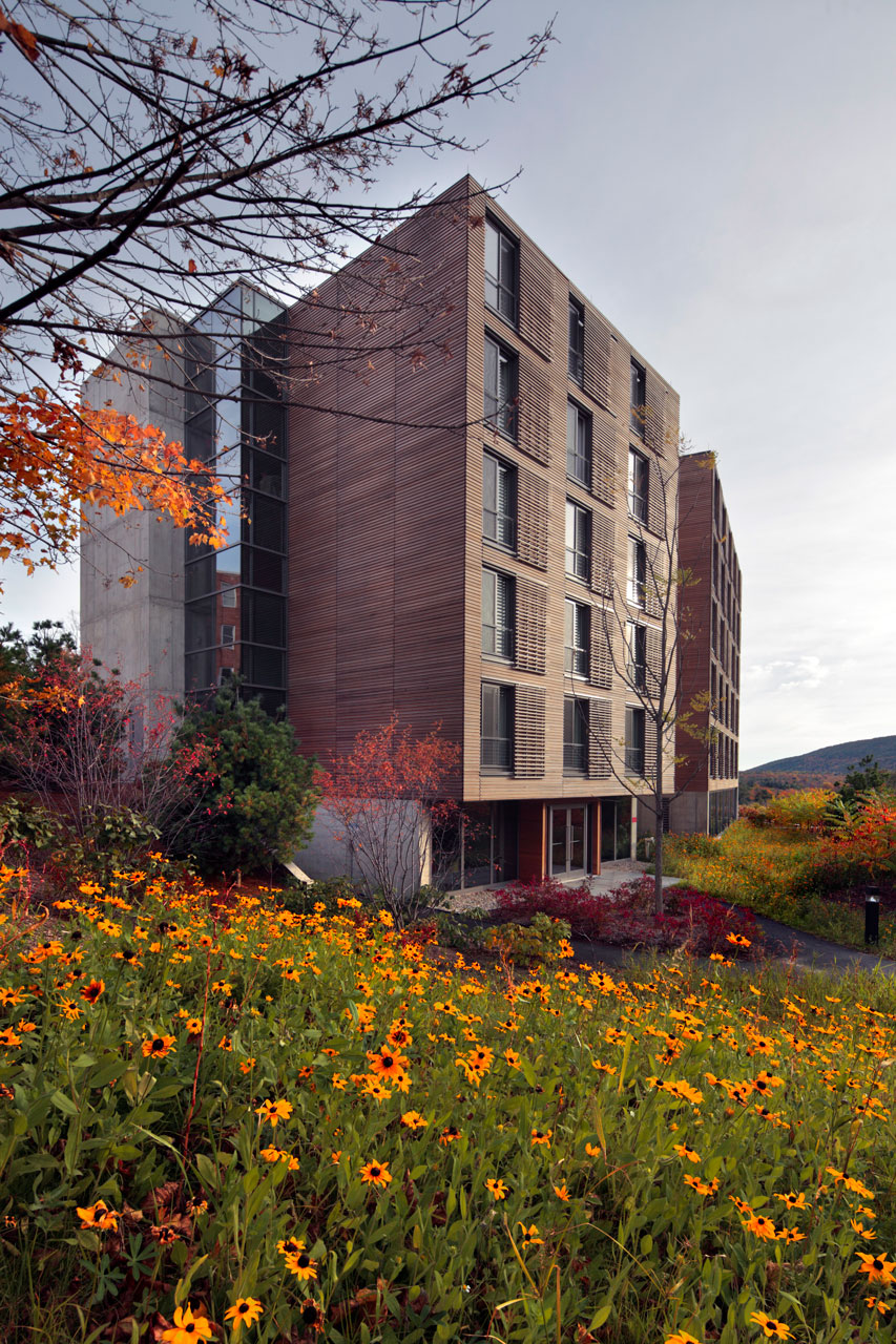 Ein ehemaliges Kloster wurde für das das neue Zentrum für Yoga und Gesundheit erweitert. Dieser Anbau verbindet das bestehende Erholungszentrum mit einem neuen Wohnkomplex. Durch die Nutzung von verschiebbaren externen Sonnenschutzelementen, einer Aktivierung der Betondecken zum Heizen und Kühlen, effektive Tageslichtnutzung sowie natürliche Belüftung etabliert sich das Kripalu Wohnhaus zu einem Eckpfeiler der Nachhaltigkeit. Ein verglaster, nach Süden ausgerichteter Korridor ermöglicht den Yogi auch bei kalten Wetterbedingungen einen warmen und hellen Durchgang zum Erholungszentrum. Die 80 Zimmer des Wohnhauses wurden an einem ökonomisch optimierten Grundriss ausgerichtet, wodurch das Gebäude in die Höhe anstatt in die Breite wächst.