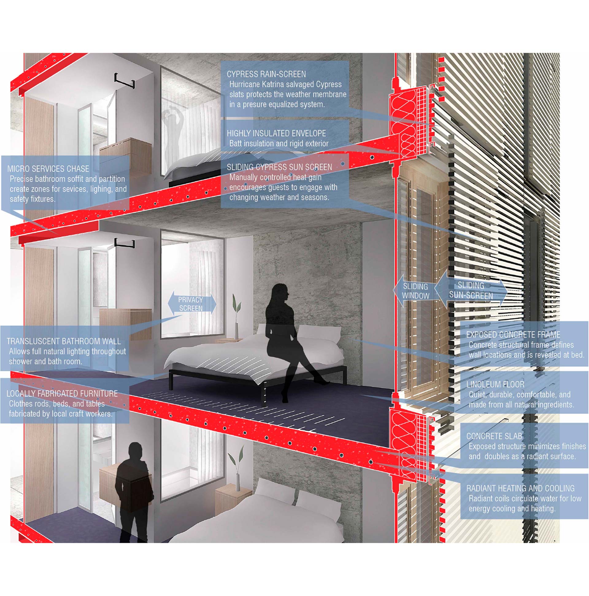 Eine Betonkernaktivierung zum Kühlen und Erwärmen des Betontragwerks dient der Grundtemperierung des Gebäudes. Jeder Raum ist zusätzlich mit einem leisen, natürlich konvektiven System zum Heizen und Kühlen ausgestattet (gravity wall), so dass jeder Bewohner die eigene Raumtemperatur einstellen kann. Das ausgeklügelte System nutzt die natürlichen konvektiven Luftströme um den Raum mit wenig Energie angenehm und geräuschlos zu temperieren. Hierfür ist ein Kühlelement im Wandschrank installiert mit Öffnungen im oberen und unteren Bereich. Im Kühlbetrieb wird Warmluft durch die Oberseite eingezogen, vom System gekühlt und strömt aus den Bodenöffnungen heraus. Im Heizbetrieb wird kühle Luft durch die unteren Öffnungen eingezogen, wird durch Wasser, das sich durch das System bewegt, erwärmt und strömt durch die Oberseite. Die ‚gravity wall‘ in Verbindung mit anderen Effizienzmaßnahmen wie die Dimensionierung der Zuluft nach hygienischem Luftwechsel inklusive Wärmerückgewinnung, öffenbaren Fenstern für natürliche Lüftung, einem beweglichen, externen Sonnenschutz sowie einer hoch gedämmten Gebäudehülle schaffen ein integrales Architekturkonzept. Dieses Klimakonzept senkt den Energiebedarf gegenüber üblichen Luftkonditionierungsmethoden um 40%.
