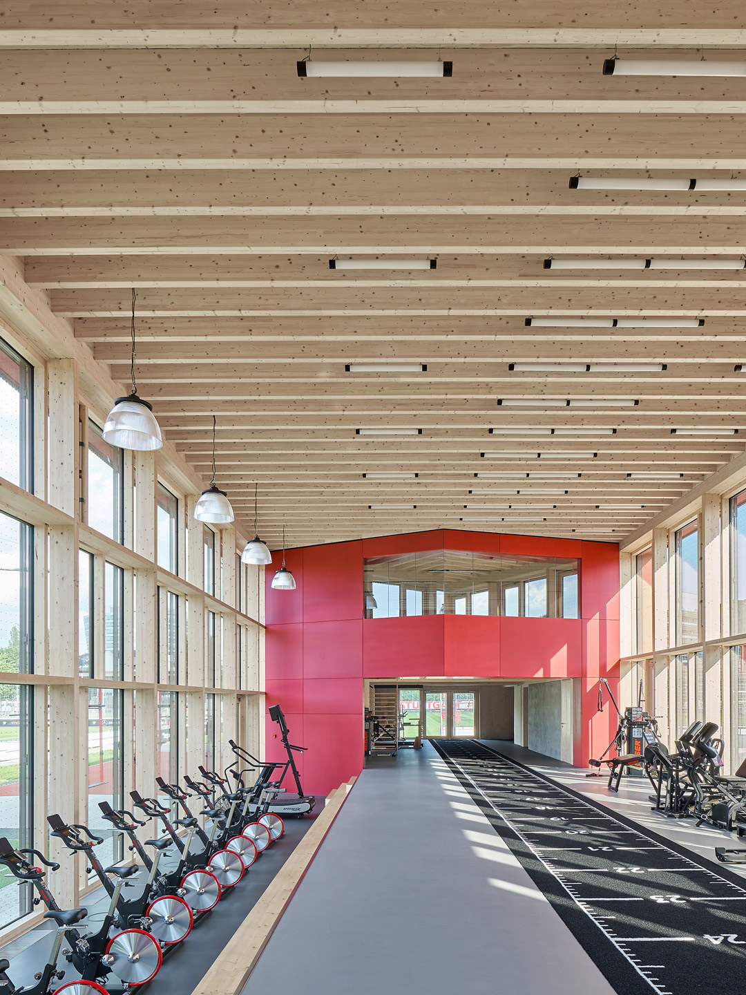 In der Athletikhalle minimiert hybride Lüftung die Lüftungswärmeverluste im Winter. Sie garantiert hohe Luftqualität unabhängig von der Fensterlüftung und ist für den hygienischen Komfort ausgelegt. Dies gilt speziell für den erhöhten Frischluftbedarf bei sportlicher Betätigung. Im Kraftraum sorgen Unterflurkonvektoren für Zuluft mit niedriger Geschwindigkeit. Durch ihre Nähe an der Fassade begegnen sie dem Kaltluftabfall an den hohen Fensterfronten.
