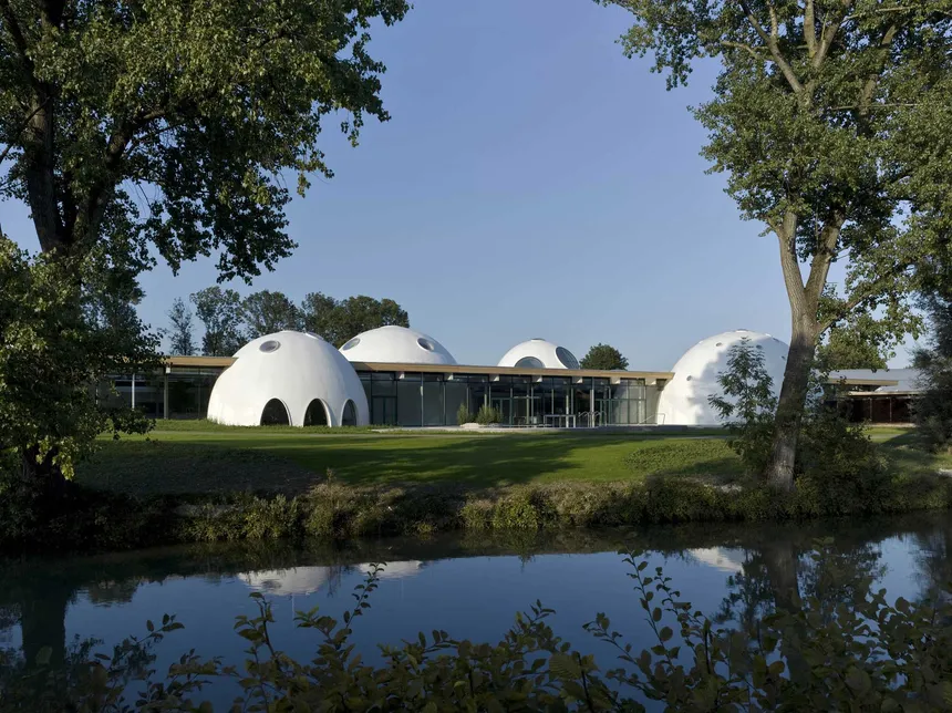 Das Klimakonzept nutzt die räumliche Trennung der verglasten Halle, die neben den Themenkuppeln die Erschließung, das Restaurant und den Liegebereiche umfasst. Ein Ziel bei der Therme Bad Aibling war es, einen hohen thermischen Komfort für die Badenden in einer Umgebung mit hoher Luftfeuchtigkeit und winterlich geringen Oberflächentemperaturen an den Glas-Oberflächen bereit zu stellen. Ein weiteres Ziel war es den Strom und Wärmebedarf im Betrieb zu reduzieren. Durch die hohe Raumtemperatur und die dadurch stetige Verdunstung an der Beckenwasseroberfläche erfordert es viel Energie, die Transmissions- und Lüftungswärmeverluste zu decken und die Fassaden durch eine Beblasung mit Warmluft und durch die Reduzierung der Raumluftfeuchte über die Lüftungsanlage kondensatfrei zu halten. Die im integrierten Planungsprozess entwickelte Kombination einer räumlichen Trennung und einem optimierten Lüftungskonzept ist das Ergebnis für dieses Ziel: durch die Verlegung der Wasserflächen in die Kuppeln, die mit einer Zuluftzufuhr in der Halle und einer Abluftabfuhr aus den Kuppeln kombiniert ist, entsteht innerhalb der Kuppeln ein feuchtwarmes Badeklima, außerhalb in der Halle ein kühleres und trockeneres Klima. Im Sommer ermöglicht das hybride Lüftungskonzept eine rein natürliche Lüftung der Therme mit hohem Luftwechsel, reduziert dadurch die notwendige Größe und Strombedarf der Lüftungsanlage und verhindert zugleich eine sommerliche Überhitzung. In der Planung wurde eine iterative Analyse und Optimierung der Tageslicht-Beleuchtung der Räume bei verschiedenen Himmelszuständen ausgeführt, die darin resultierte, dass das Dach - ausgehend von einer Vollverglasung im Wettbewerb - in der Ausführung mit einem Verglasungsanteil von 15% entwickelt wurde. Durch eine dezidierten Platzierung und Größe der transparenten Elemente erhalten die Halle und Kuppeln eine spezifische, auf die Nutzung der jeweiligen Bereich zugeschnittene natürliche Beleuchtung, die wiederum als Basis der Kunstlichtplanung diente.