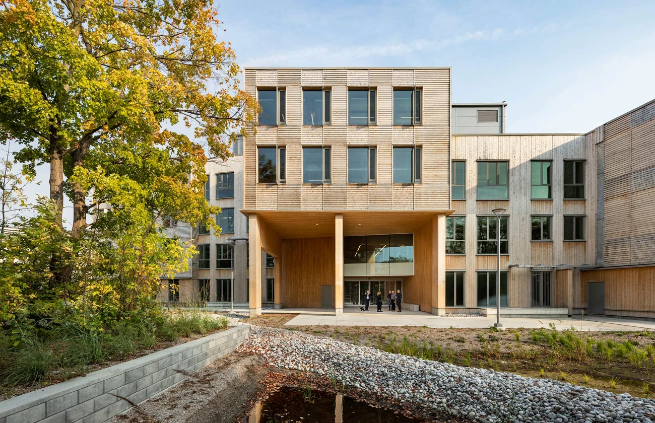 Die Gebäudehülle hat auf der Südseite mehr Glas und auf den anderen Seiten weniger, um die solare Wärmegewinnung zu optimieren. Die Fenster auf allen Seiten können zur natürlichen Belüftung geöffnet werden. Damit sie auch in den kälteren Monaten genutzt werden können, sind vor den nach Süden ausgerichteten Fenstern zusätzliche Verglasungen angebracht. Dort erwärmt die Sonne die Luft im Zwischenraum, und bei günstigen Bedingungen können die Nutzer die Fenster öffnen. Die zusätzliche Verglasung schützt auch die Außenjalousien, die im Sommer automatisch heruntergelassen werden, um einen Wärmegewinn zu verhindern. Die anderen Seiten des Gebäudes sind mit dreifach verglasten Fenstern und feststehenden vertikalen Lamellen ausgestattet. Verschiedene Arten von Holzschindeln mit dicker Holzfaserdämmung verkleiden die undurchsichtigen Fassadenbereiche.