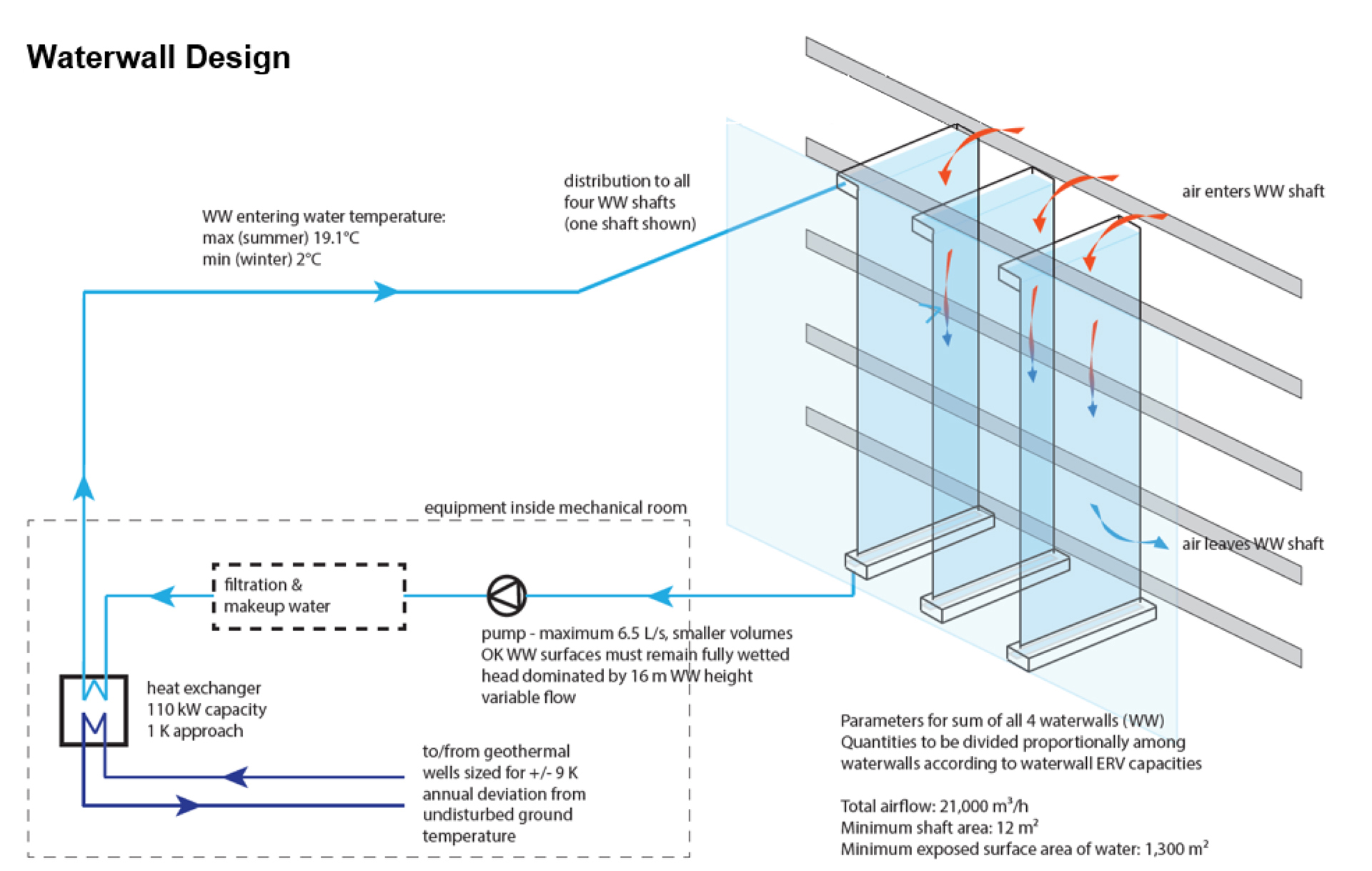 Diese „Wasserwände”, die an den gegenüberliegenden Enden jedes Atriums deutlich sichtbar sind, symbolisieren die wasserorientierte Mission der Agentur, schaffen eine Verbindung zur Natur und zeigen anschaulich, was Rohre und Kanäle normalerweise verbergen, da sie wesentliche Bestandteile der Klimaanlage sind und einen geringen Energieverbrauch gewährleisten. Die Wasserwände sind mit einem offenen geothermischen System gekoppelt, das die relativ stabile Temperatur des Grundwassers nutzt, um die Zuluft zu konditionieren, während sie entlang des Wassers durch die transparenten, verglasten Schächte strömt.
