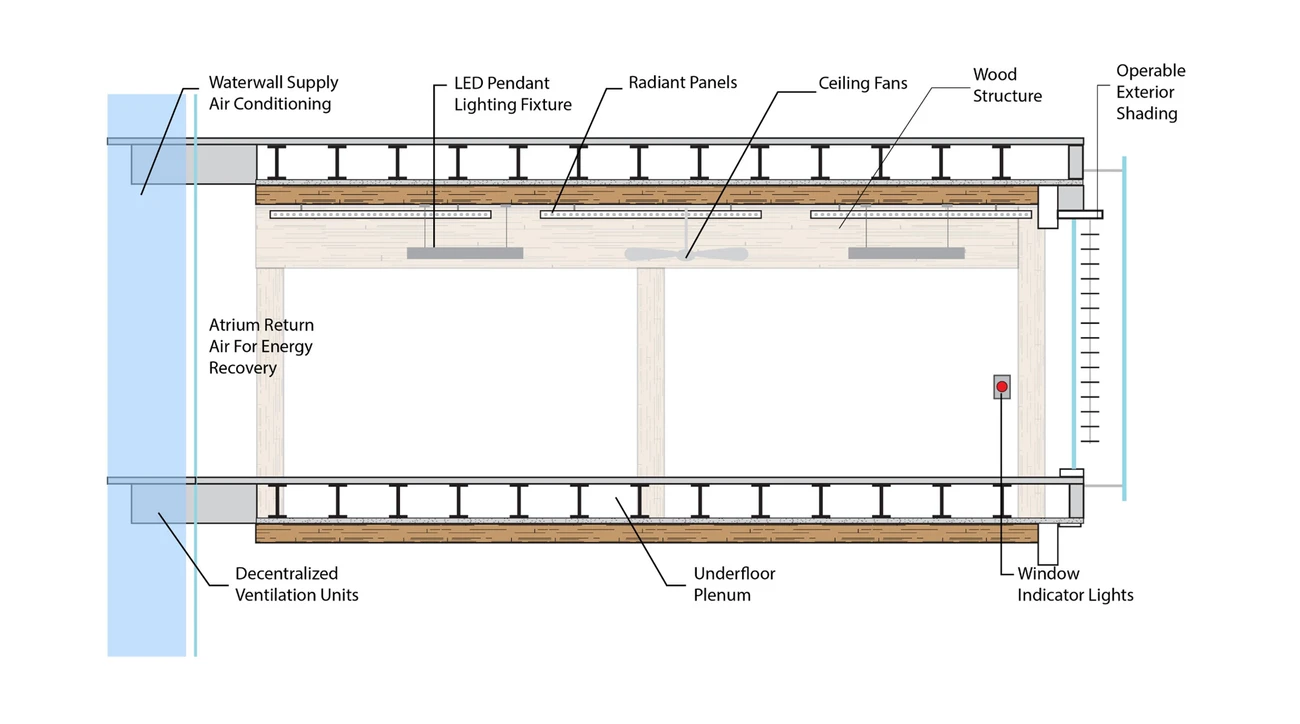Da es keine herkömmlicher Lüftungskanäle und zentrale Ventilatorraums vorhanden sind, ist ein 360°-Panoramablick in dem Gebäude möglich. Auf jeder Etage saugen Lüftungsgeräte die Luft aus einem Schacht an, erwärmen oder kühlen sie je nach Bedarf auf die gewünschte Temperatur und leiten sie mit geringer Geschwindigkeit durch einen Unterflur-Plenum in die Bürobereiche. Die Geräte saugen die Abluft aus dem Atrium mit Wärmerückgewinnung in einen Kanal, der in jedem Schacht verborgen ist, bevor sie oben durch die Lüftungsöffnungen jedes Turms austreten.