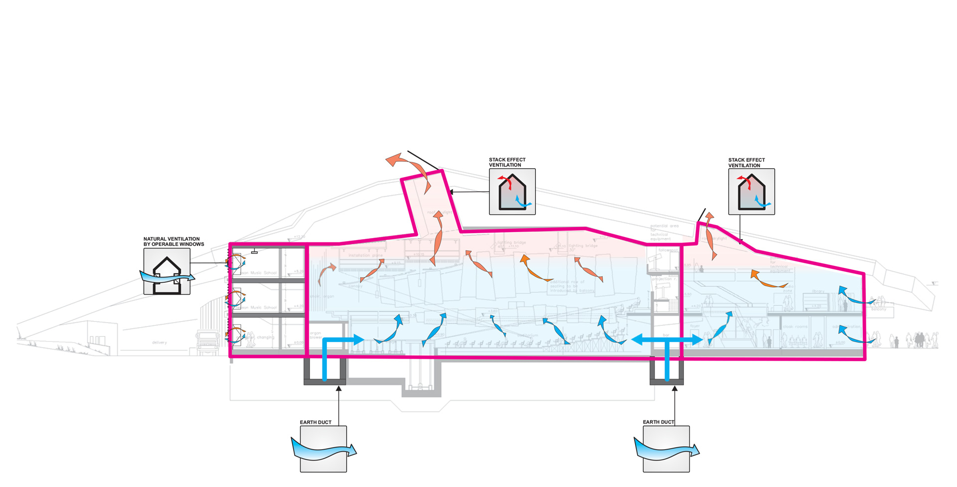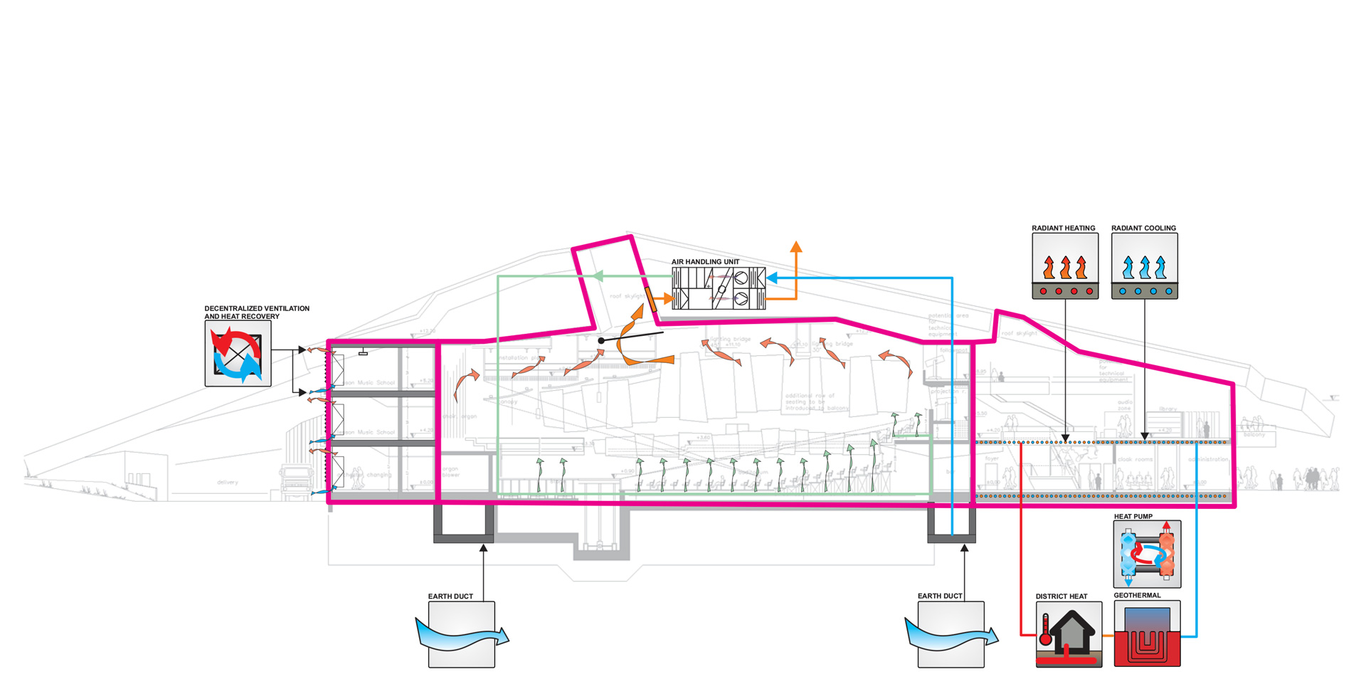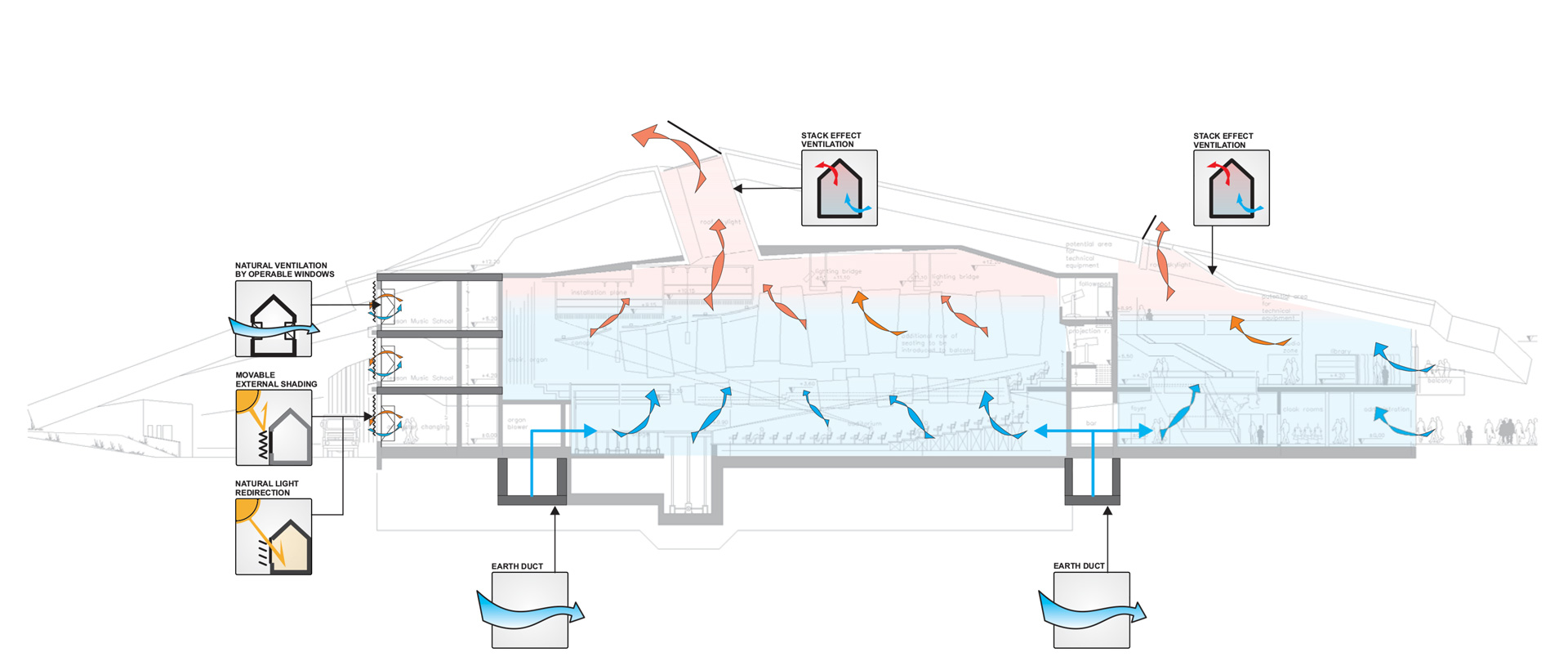 Das Gebäude hat eine Hybridlüftung, also eine natürliche Lüftung durch manuell bedienbare Fassadenöffnungen kombiniert mit zusätzlichen dezentralen mechanischen Lüftungsgeräten, die nur im Bedarfsfall raumweise aktiviert werden. Die technischen Schächte und Installationsflächen sind dadurch minimiert. Nutzer können direkt Eingriff auf die Belüftung nehmen, sofern dies aus akustischen Gründen oder aus Gründen der Luftqualität erwünscht ist. Die Belüftung der Haupthallen erfolgt entsprechend der Jahreszeit und der inneren Luftqualität auf natürliche Weise über Erdkanäle und Dachöffnungen und wird ausgerichtet auf den jeweiligen Raum mit Bedarf. Sofern die Luftqualität zu schlecht oder die Temperatur im Innenraum zu hoch wird, schalten die aktiven Lüfter zu, um die erforderliche Konstanz und hohe Qualität der Raumluftkonditionen aufrecht zu erhalten.