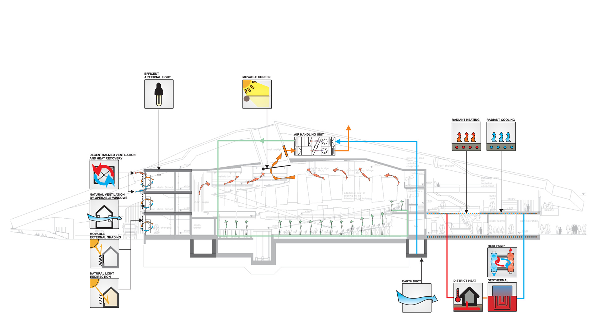 Wesentlich für das Konzept sind Luftdichte und hoch wärmegedämmte Fassaden mit Dreifachverglasung, kombiniert mit beweglicher Verschattung in Kastenfenstern. Hinzu kommt die hocheffiziente sensible (1 s.u.) und latente (2 s.u.) Energierückgewinnung in den großen Hallen: Die Sorptionsräder (3 s.u.) haben eine Wärmerückgewinnungszahl von bis zu 85% und übertragen zusätzlich Feuchte aus der Abluft in die Zuluft, was hier der Instrumente wegen besonders wichtig ist und sich angesichts langer Heizperioden auch auszahlt.