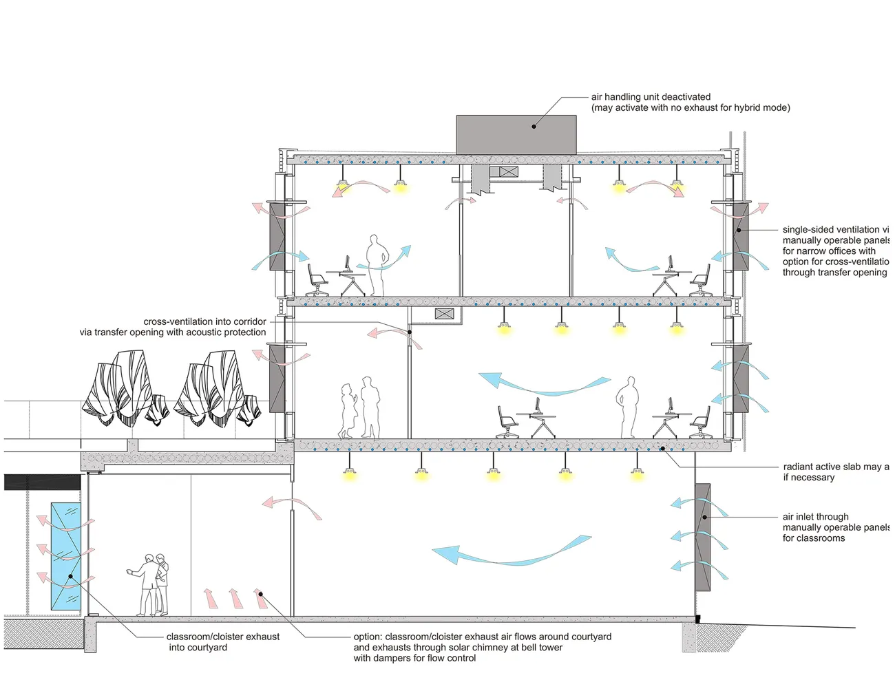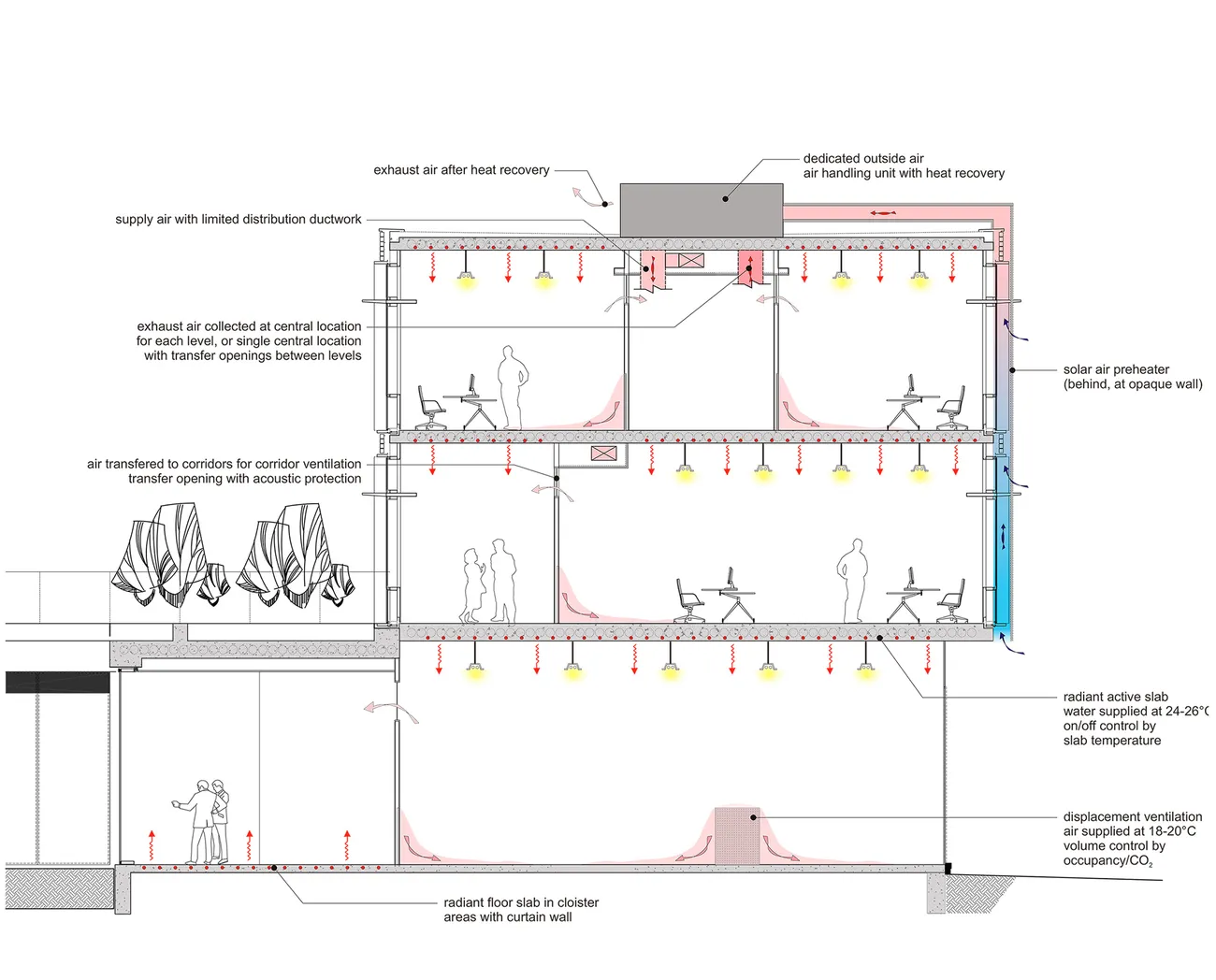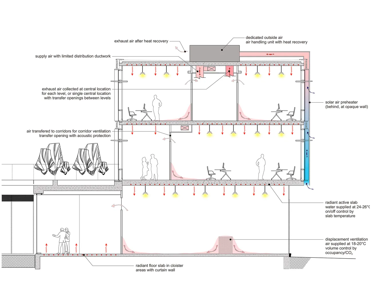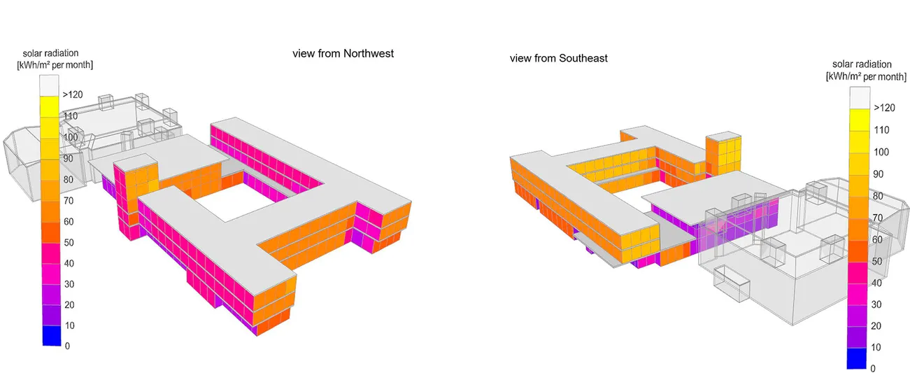 Von Transsolar wurden außerdem Fassadenstudien zur Optimierung der Tageslichtversorgung durchgeführt und Konzepte zur natürlichen Lüftung des Gebäudes erstellt.