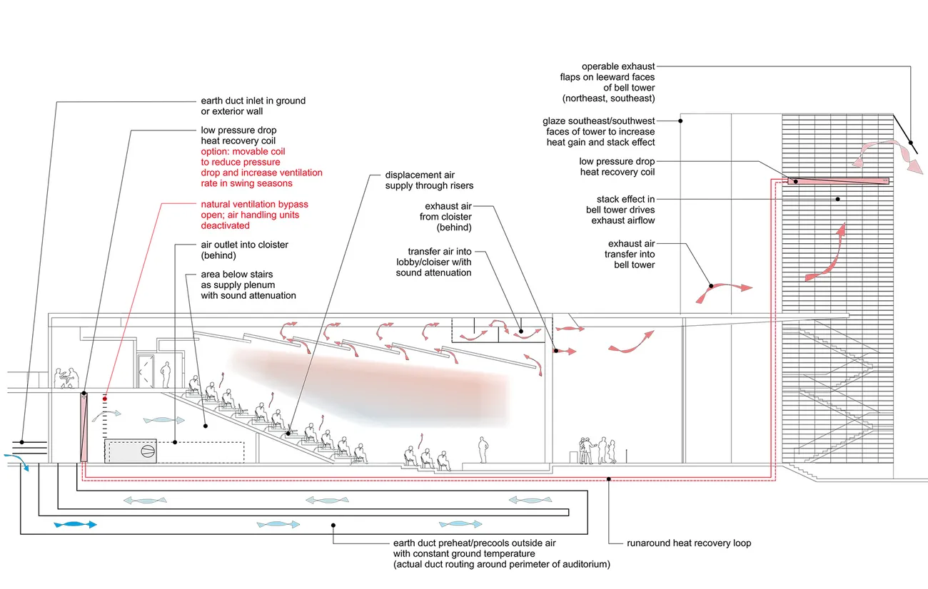 Unter anderem wurde das Potenzial des Glockenturms als Solarkamin untersucht. Durch diese Maßnahmen ist eine Energieeinsparung von 65% gegenüber dem Ontario Building Code möglich.