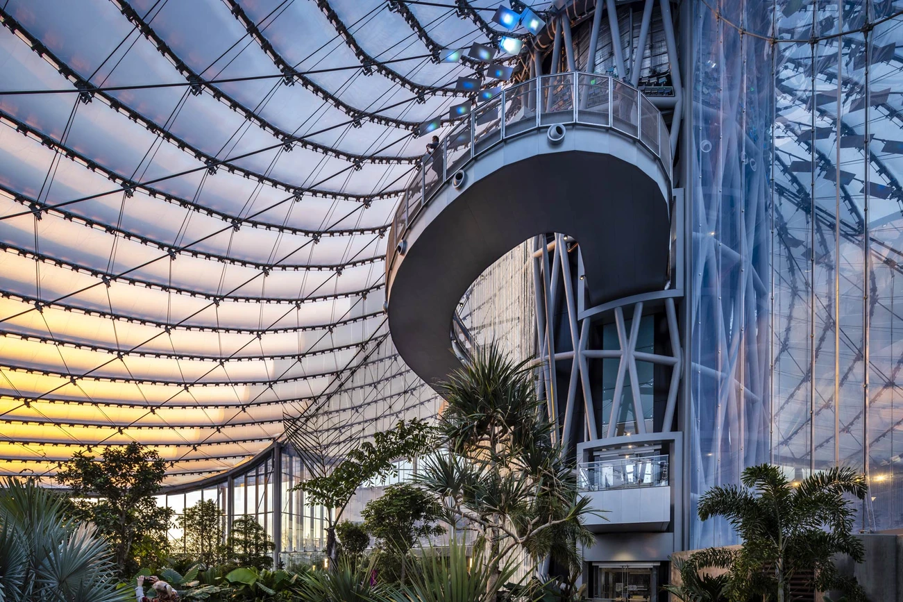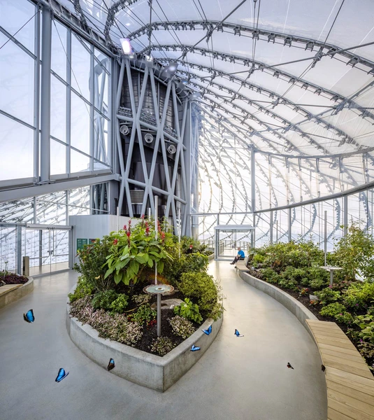 Die transparente Hülle schafft eine natürliche Umgebung, in der die Besucher ein exotisches Klima erleben können. Der Heizbedarf im Winter wird durch ein hydronisches Heizsystem für die Wurzeln reduziert, das über Nacht kühlere Innenlufttemperaturen ermöglicht.