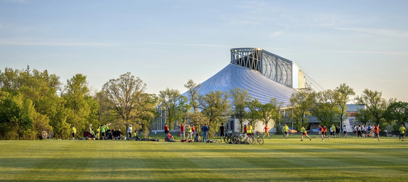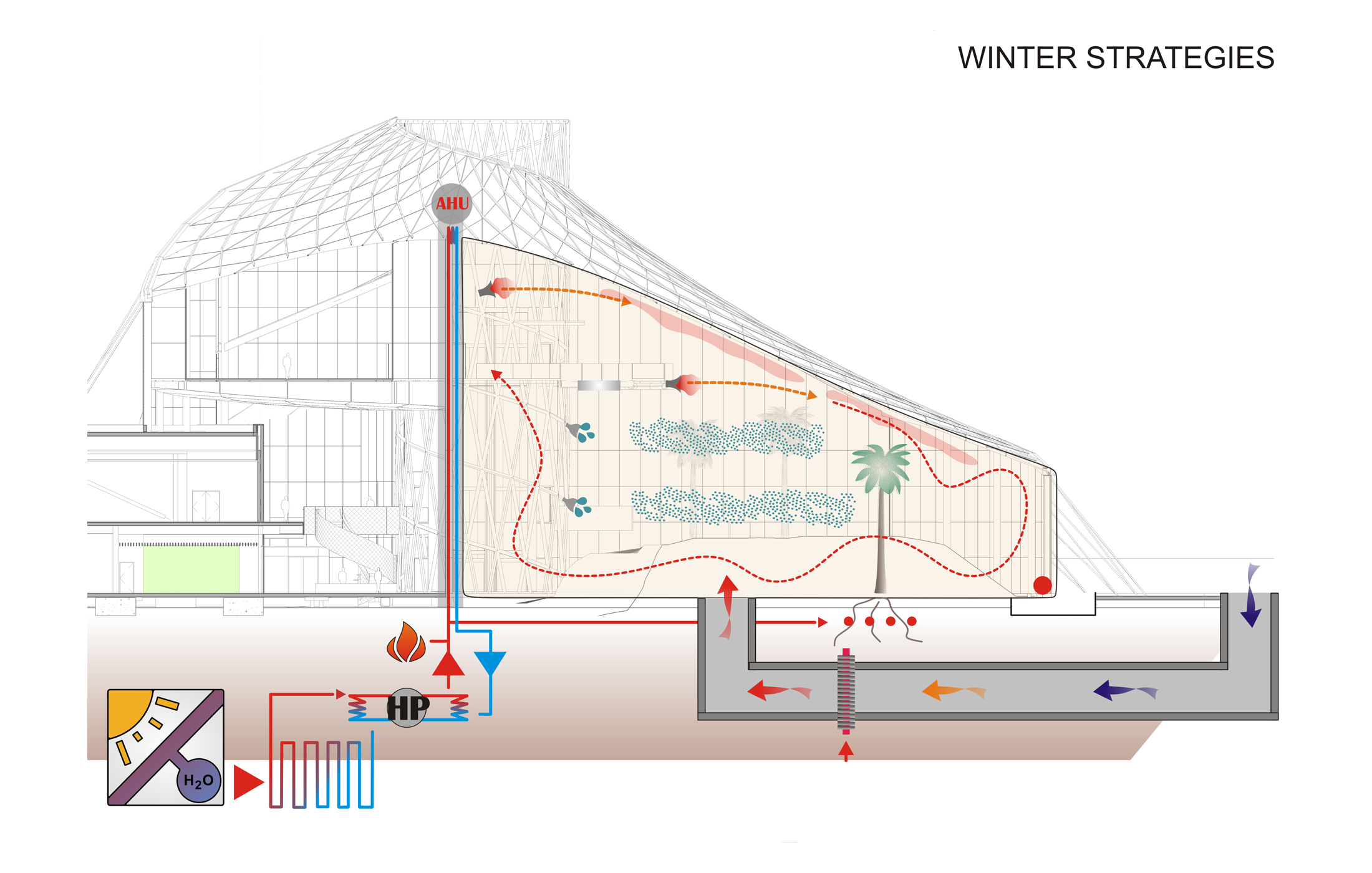 Das Konzept von Transsolar konzentrierte sich auf die Schaffung idealer Wachstumsbedingungen für Pflanzen bei minimalem Ressourceneinsatz: Der Zugang zur Sonne ist ebenso wichtig wie die passive Steuerung der Innenraumbedingungen (Lufttemperatur und -feuchtigkeit). Der strenge Winter in Winnipeg in Verbindung mit einer hohen Sonneneinstrahlung stellt das angestrebte Umweltziel in Frage, was maßgeschneiderte Strategien zur Klimatisierung des Raums erfordert, um die Innenraumziele auf energieeffiziente Weise zu gewährleisten.