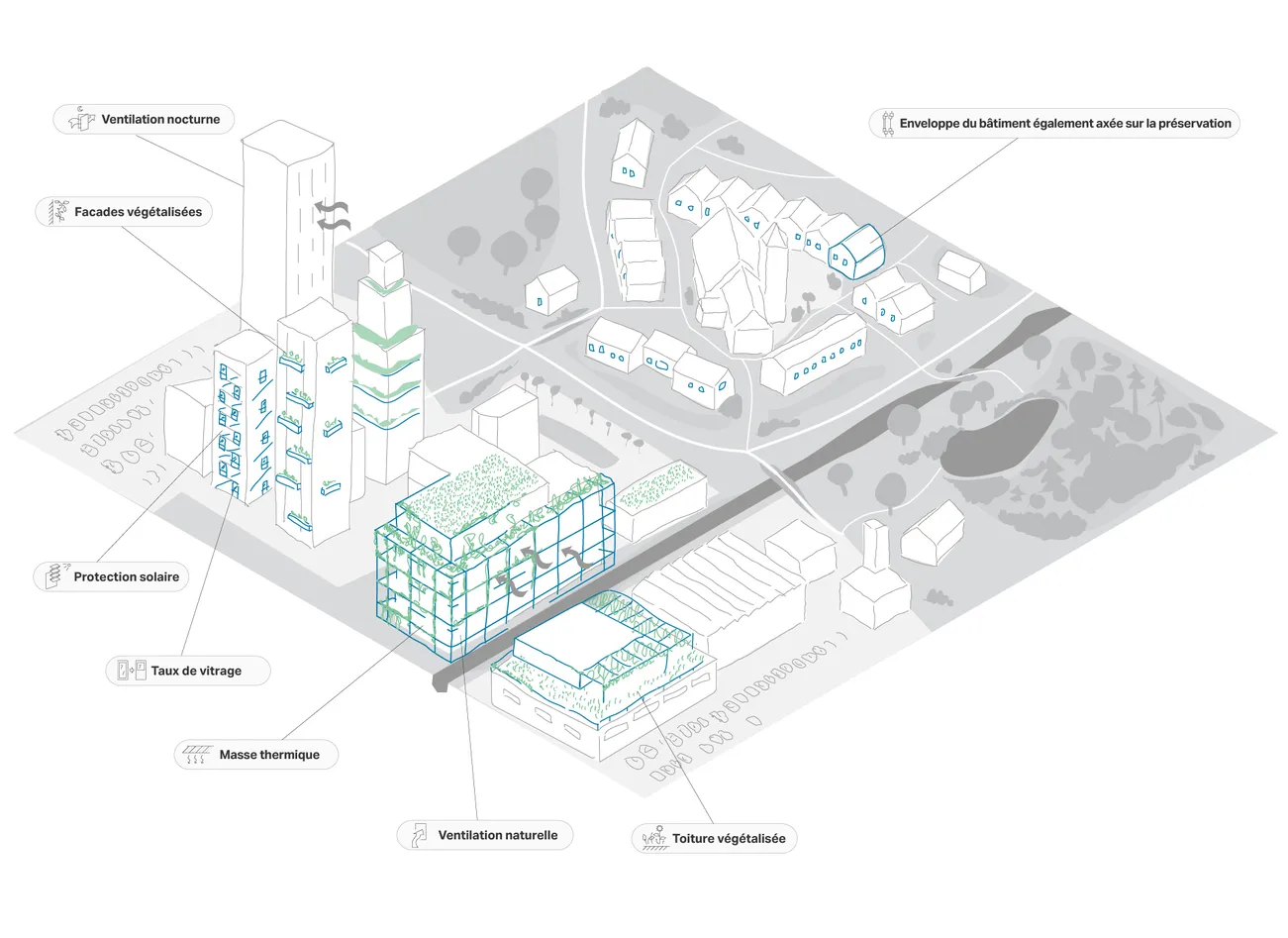 La clé est d'utiliser le contexte du projet de construction pour créer des connexions et des synergies. Souvent, un seul bâtiment ne peut pas parvenir à être neutre en carbone dans son exploitation, mais peut atteindre une exploitation climato-neutre lorsque associé avec d'autres. Ce qui est de la chaleur résiduelle pour une entreprise, par exemple, peut servir de source de chaleur pour d'autres et même être stockée. Nos concepts holistiques pour les quartiers et les villes visent à combiner atténuation du climat et adaptation, c'est-à-dire la durabilité et la fonctionnalité des bâtiments même dans le climat futur.