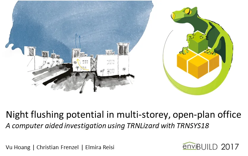 At the enviBUILD at the TU Vienna Vu Hoang will present how TRNLizard, an integrated thermal, daylight and airflow simulation tool based on Rhinoceros 5, Grasshopper, TRNSYS18, DaySIM and TRNFlow can be used to develop and validate the concept for an energy efficient office building with a healthy, comfortable environment. The office building is located in Germany with a highly glazed façade and night ventilation for passive cooling. It is shown that night flushing reduces annual end-use cooling energy and peak cooling load of mechanical air conditioning systems by 55% and 15%, respectively.