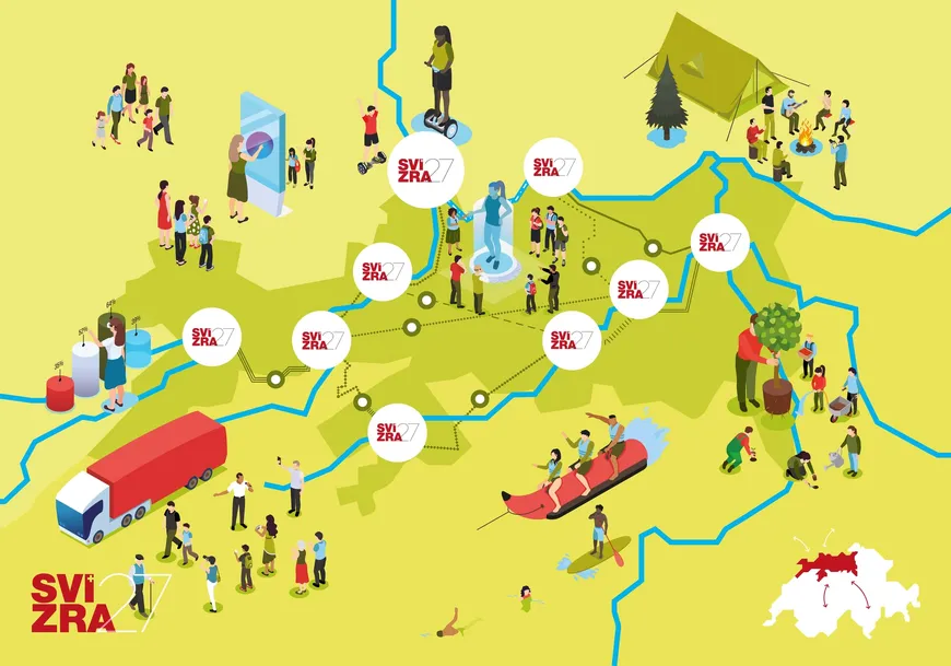 Der nächste Schritt ist eine Machbarkeitsstudie. In den nächsten zwei Jahren wird das Projekt konkretisiert und auf Akzeptanz getestet. Svizra27 ist als großes, experimentelles Spiel angelegt. Neun Standorte in den fünf Nordwestschweizer Kantonen, welche innerhalb der Machbarkeitsstudie definiert werden, stehen stellvertretend für die Raumtypologien Metropole, Städtenetz sowie Kleinstadt und Dorf im ländlichen Raum, basierend auf der Hauptthematik «Mensch – Arbeit – Zusammenhalt».