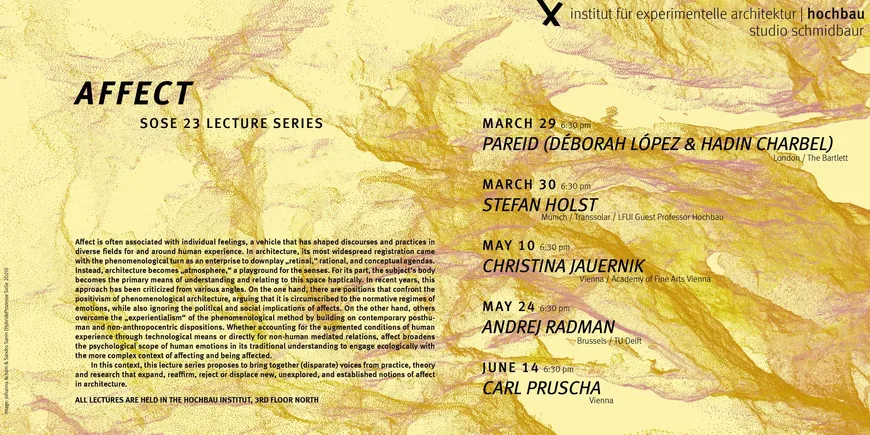 In this context, this lecture series proposes to bring together (disparate) voices from practice, theory and research that expand, reaffirm, reject or displace new, unexplored, and established notions of affect in architecture.