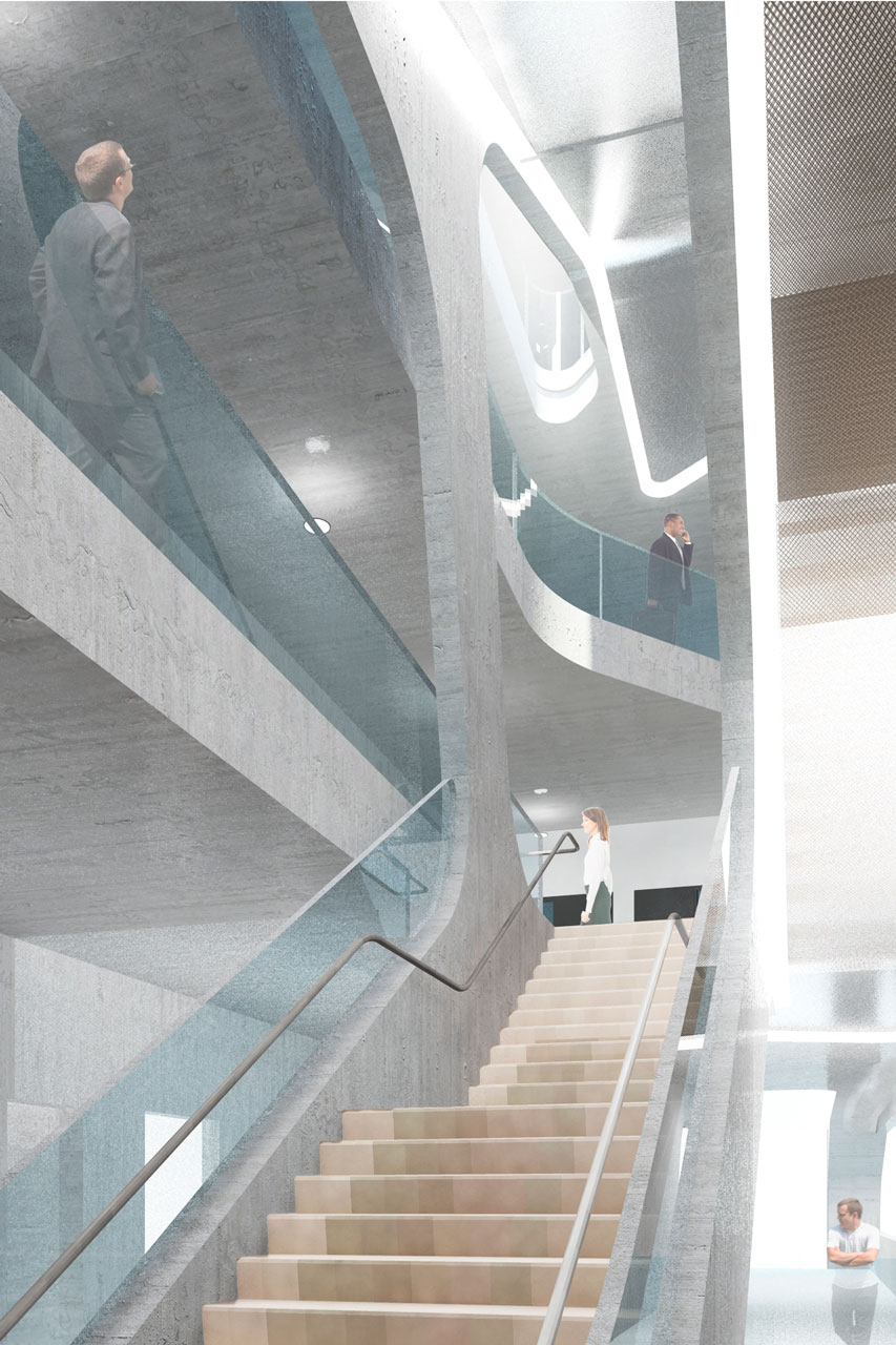 The FOM University of Economics & Management offers academic training opportunities in 31 locations. Under the helm of the FOM University of Applied Sciences, the BCW (BildungsCentrum der Wirtschaft) is planning a new university building in Berlin's Charlottenburg-Wilmersdorf district near the Tiergarten – in accordance with the design plans of the architecture firm J. MAYER H. and Partners. The building's five floors house a foyer with cafeteria, lecture halls, seminar rooms, administrative offices, library / reading room and group room. Underground parking is located in the basement, in addition to technical areas. The monolithic building envelope, interrupted by generously glazed windows, is the main characteristic of the building as well as the formative and identity-creating architecture. The windows are conceived as a 2-shell construction of box windows. They are of course ventilated by means of permanent openings and sealed off floor by floor. The box windows take on the motor-driven sunscreen. The inner primary façade can be opened manually. Using lightweight concrete, there is no core insulation in the opaque façade components. The objective is the development of a high-quality building with innovative, structural measures, minimized and efficient building technology with good user comfort and low energy requirements. On all levels, a cavity floor with regularly arranged maintenance openings provides the necessary flexibility with regard to changes in usage units, room layouts and media distribution. The comfort concept uses the thermally activated component mass in the foyer floor or in the exposed, massive ceiling areas of the main usable areas. Thermally highly loaded seminar rooms and lecture halls also have acoustically effective cooling ceiling panels. Additional heat loads are dissipated convectively via ground-integrated fan coils. The entire building is mechanically ventilated; the air change rates are adjusted according to CO₂ requirements. The heat supply is provided by the district heating network of Berlin. Wherever possible, the cooling requirements of the building are met by free, adiabatic cooling by means of re-cooling systems on the roof and by ventilation-integrated exhaust air humidification.