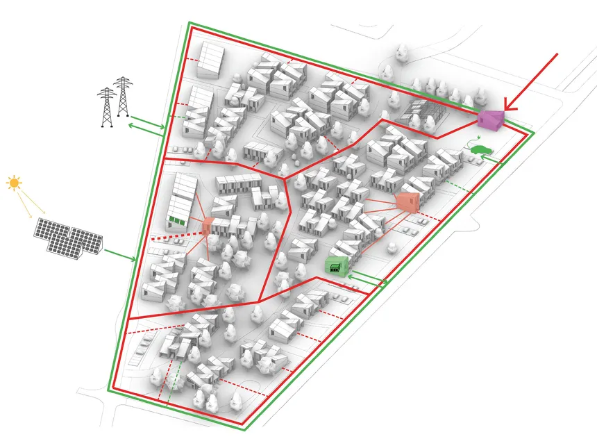The 10,000 m² (107,639 ft²) pilot project in Berlin mainly consists of residential units, with some space allocated for co-working, mobility hub, clubhouse, and fitness areas. If waste heat from an external data center is fed into the neighborhood’s heating network, the remaining heat demand can be met by a “Energy Center” using groundwater-based heat pumps. The neighborhood produces its own solar electricity via rooftop PV systems and buffered by a battery storage system.
