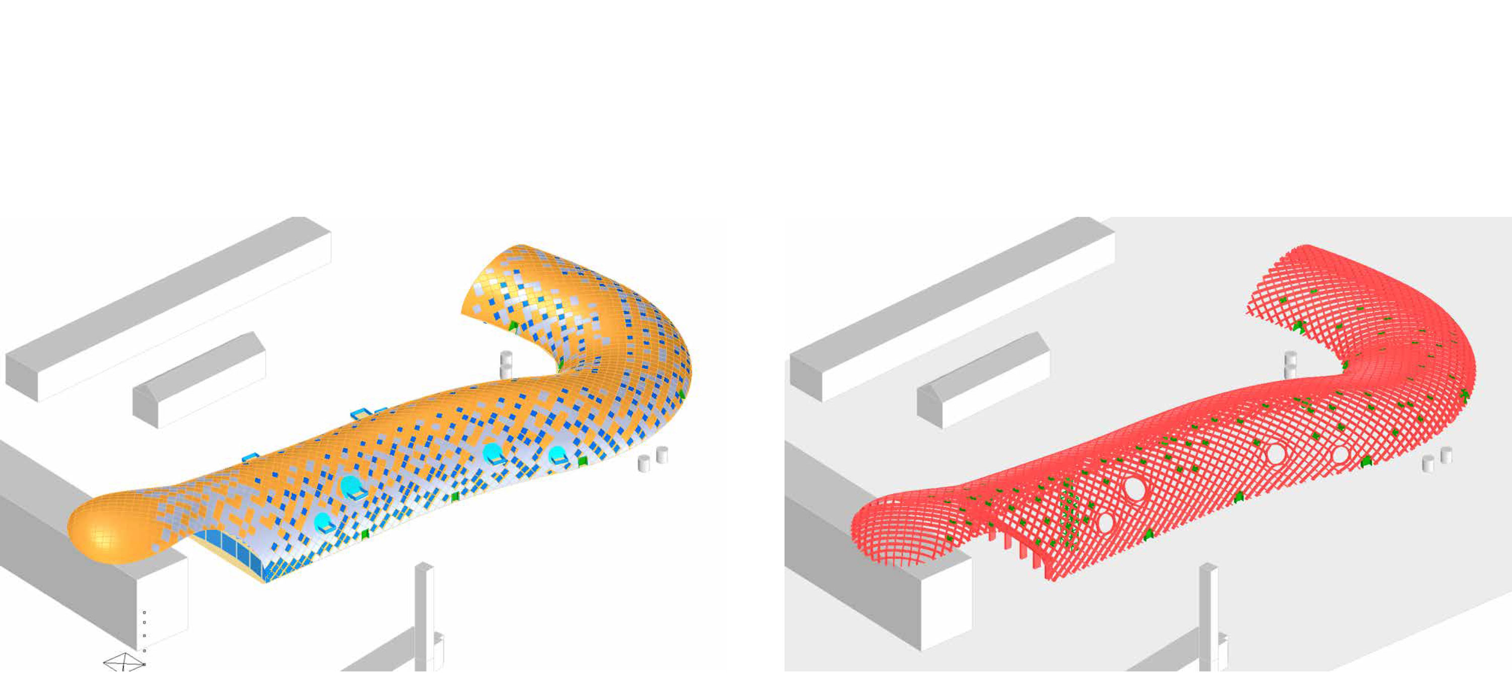 La forme sinueuse du siège social s'étend de l'autre côté de la rue pour le Musée Cité du Temps. Un pont au troisième étage relie les deux bâtiments. La construction du toit en treillis se compose de 4.600 éléments individuels en bois qui s'emboîtent les uns dans les autres. Le concept du bâtiment est axé sur le confort des employés, leur bien-être et leur productivité: des éléments acoustiques sont insérés dans les plafonds en béton et un système d'activation du noyau en béton assure le confort thermique. Une ventilation mécanique couvre les exigences hygiéniques minimales, l'air d'alimentation entre dans le bâtiment selon le principe du déplacement, minimisant ainsi le risque de courants d'air et assurant une grande efficacité de ventilation. Trois éléments de construction différents forment l'enveloppe de la façade d'environ 11.000 m²: des éléments en verre à triple vitrage permettent de limiter les pertes thermiques, les ombres à l'extérieur sont protégées par une simple vitre en verre formant une cavité fermée. Ensuite, il y a des éléments de membrane translucides avec de faibles valeurs U et une couche intermédiaire spéciale qui permet à la lumière diffuse d'entrer. Troisièmement, il y a les éléments fermés avec la valeur U la plus faible, qui sont recouverts de PV là où ils sont horizontaux ou orientés au sud. Leur disposition et leur distribution proportionnelle ont été optimisées en fonction de la vue (éléments vitrés), de la répartition de la lumière du jour dans la pièce, de la valeur U globale et des meilleurs gains énergétiques pour le PV.