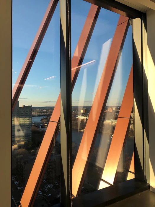 Transsolar a guidé l'équipe en démontrant à la BU comment elle pouvait construire le plus grand bâtiment neutre en carbone de Boston depuis la mise à jour de 2019 du plan d'action climatique de la ville. Deux systèmes de façade différents sont utilisés pour la protection solaire : des persiennes diagonales extérieures ainsi qu’un motif de façade en dents de scie. Transsolar a optimisé la conception de ces systèmes, qui contribuent à l'aspect iconique du bâtiment et garantissent les meilleures performances globales possibles en matière de thermique et de lumière du jour. La réduction des pertes de chaleur par l'enveloppe du bâtiment est également d'une importance stratégique capitale. À cette fin, un triple vitrage avec un double revêtement à faible émissivité est utilisé. Les performances globales d'isolation du mur-rideau ont été optimisées au cours de plusieurs itérations, afin de garantir non seulement le confort thermique, mais également la meilleure performance énergétique possible.