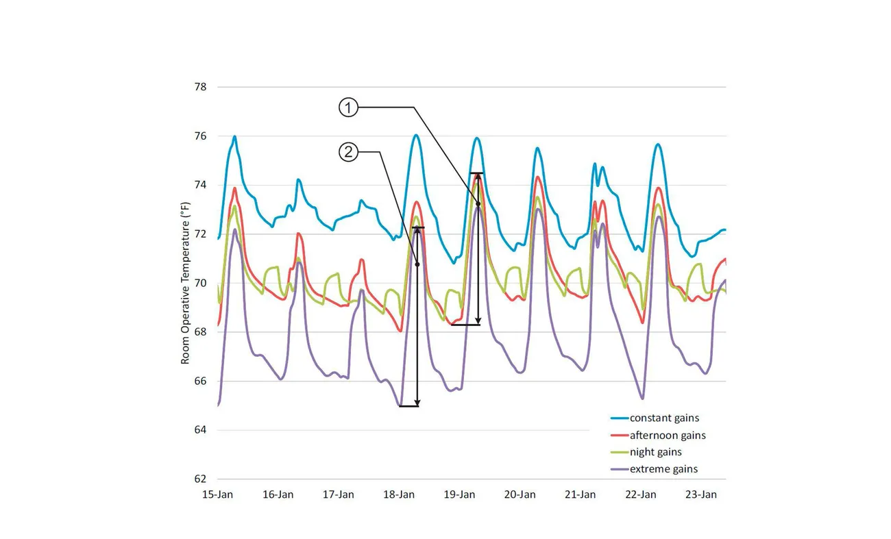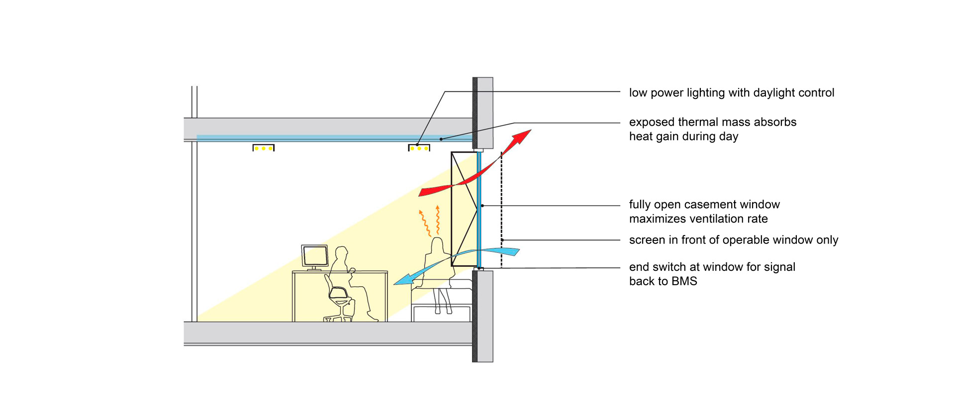 Le concept climatique global est centré sur l'expérience des étudiants dans le dortoir. L'ombrage extérieur fixe unique a été conçu pour remplir plusieurs fonctions : fournir un contrôle solaire et une protection contre les chutes, ainsi que maximiser le débit de la ventilation naturelle. Cela permet d'obtenir une solution à haut niveau de confort et à faible consommation d'énergie, dans laquelle une dalle radiante assure le chauffage et le refroidissement et une ventilation minimale est fournie pour la qualité de l'air. Le mode de ventilation naturelle est activé pendant un tiers de l'année.