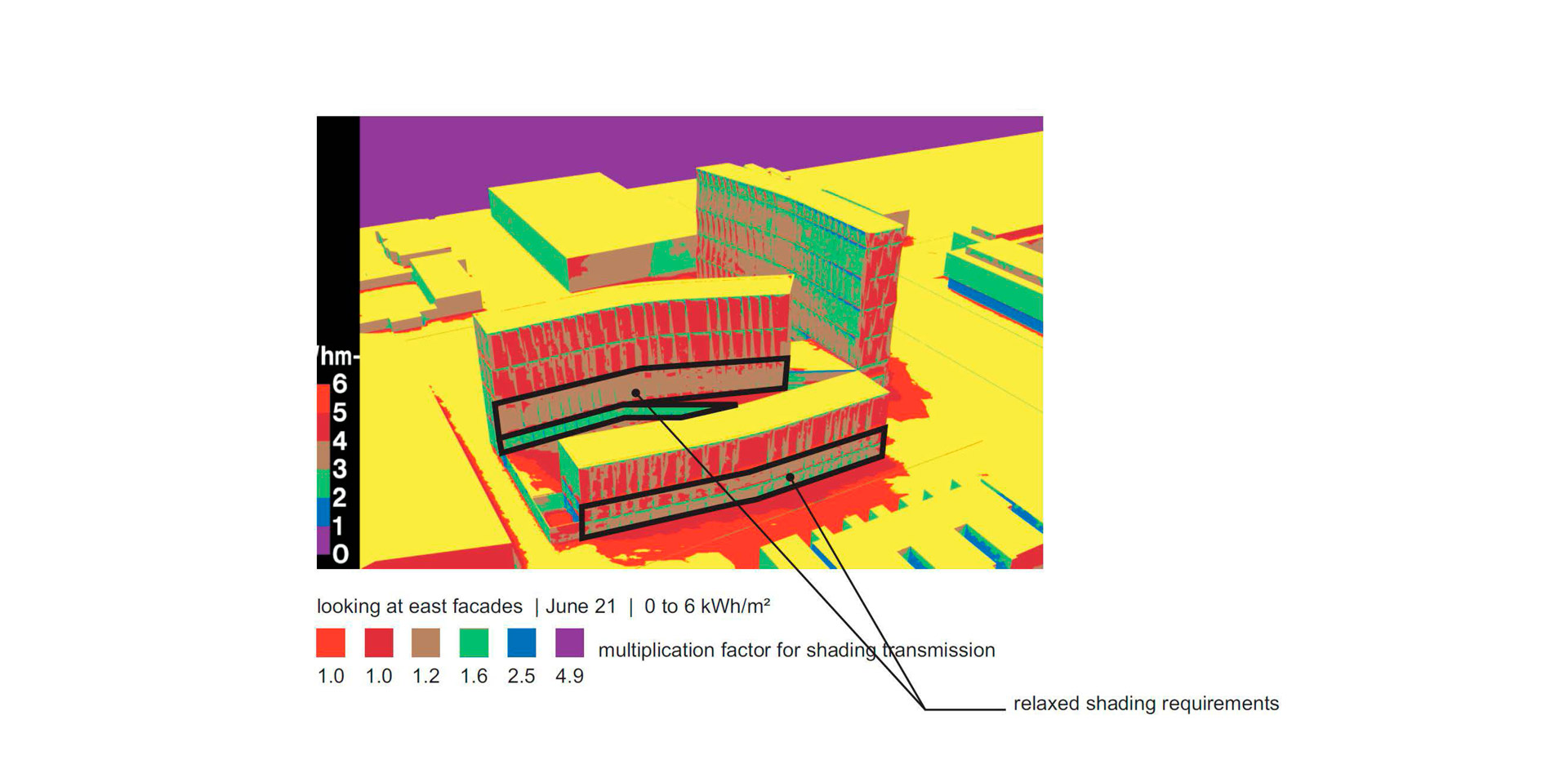 Transsolar a analysé et optimisé les performances des systèmes architecturaux et mécaniques en utilisant des simulation de lumière du jour et des simulations thermiques avancées, en conseillant et en coordonnant des caractéristiques telles que le double vitrage avec double revêtement à faible émissivité, les commandes de fenêtres pour la ventilation naturelle, l'ombrage fixe pour les dortoirs, le contrôle de la dalle radiante, la justification de la gradation de la lumière du jour et la configuration de la centrale de traitement de l'air. La consommation énergétique globale du site est estimée à 130 kWh/m²a, soit une amélioration de 57 % par rapport aux dortoirs typiques de cette région.