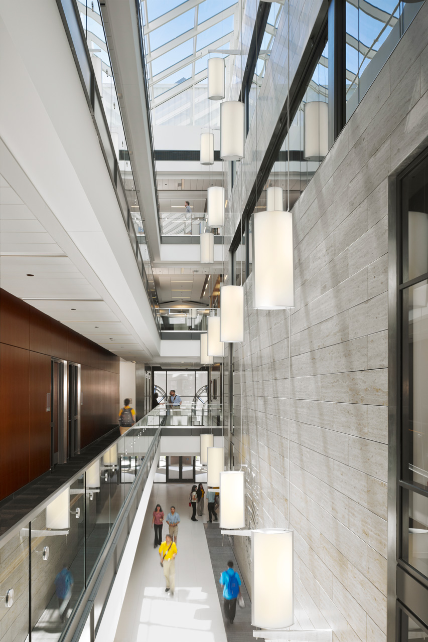 Ce bâtiment de salles de cours lumineuses est devenu l’entrée Sud de la Loyola University. L’université souhaitait un bâtiment s’inscrivant de manière harmonieuse aux bâtiments en brique du campus existant, ce qui résulta dans un extérieur composé de brique, calcaire et tuiles d’argile. Quant à l’intérieur, il expose fièrement les choix actifs et passifs pour le développement durable. Un atrium central organise les salles de cours et les espaces des facultés, et bénéficie d’une ventilation naturelle et de lumière naturelle abondante, il constitue le véritable coeur du campus. Le résultat est un bâtiment prêt pour la neutralité carbone avec une certification LEED Gold et une consommation énergétique inférieure à 94 kWh/m2– vérifiée en occupation.