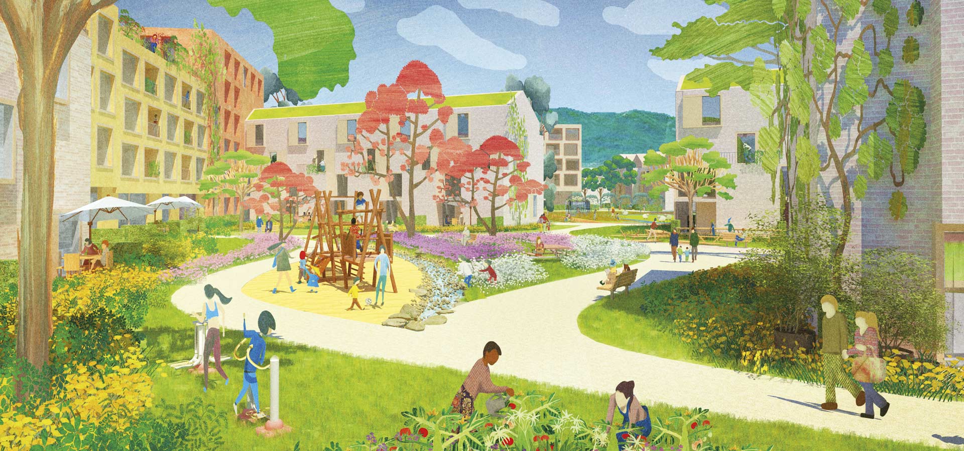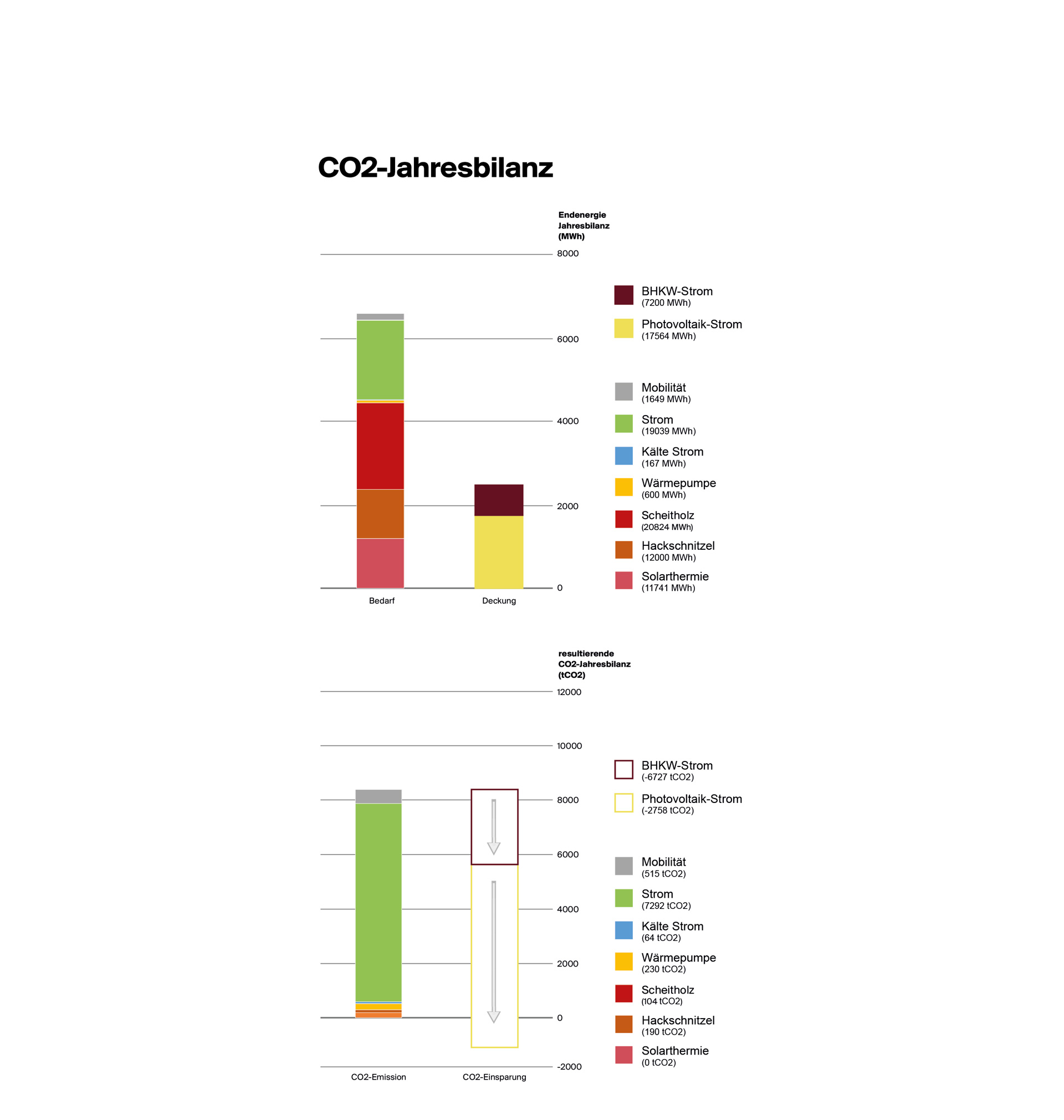 After completion, the annual electricity generation of the entire quarter will be in total around 17,600 MWh, by about 142,000 m² photovoltaics on the roofs and south-facing facades. In addition, 33,000 m² of the solar thermal system provides energy buffered in the seasonal heat storages. In each of the four district sections an energy centre will be well integrated into the landscape architecture in a socalled neighbourhood garage. And alos power storage units shall be integrated there. Each part of the quarter will get with this its own "energy heart". This approach to a synergetic and integral concept, combined with the optimised design of buildings and roofs, not only gives the neighbourhood way to run "CO2-negative", but also makes it green and worth to live in.