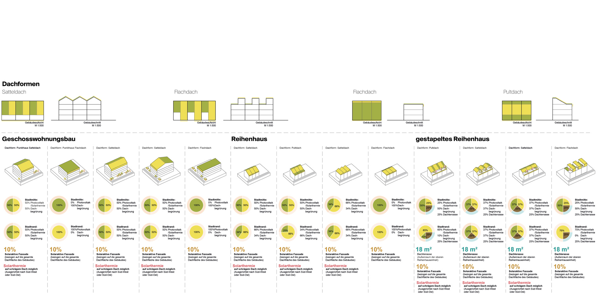 A developing urban surrounding increases building density and comes to a point where the issue inevitably raises how to use best the surfaces of roofs and façades. Then the planners have to decide which of the uses should be prefered: energy generation, greening or terraces? - Or they have look for ways that allow compromises.