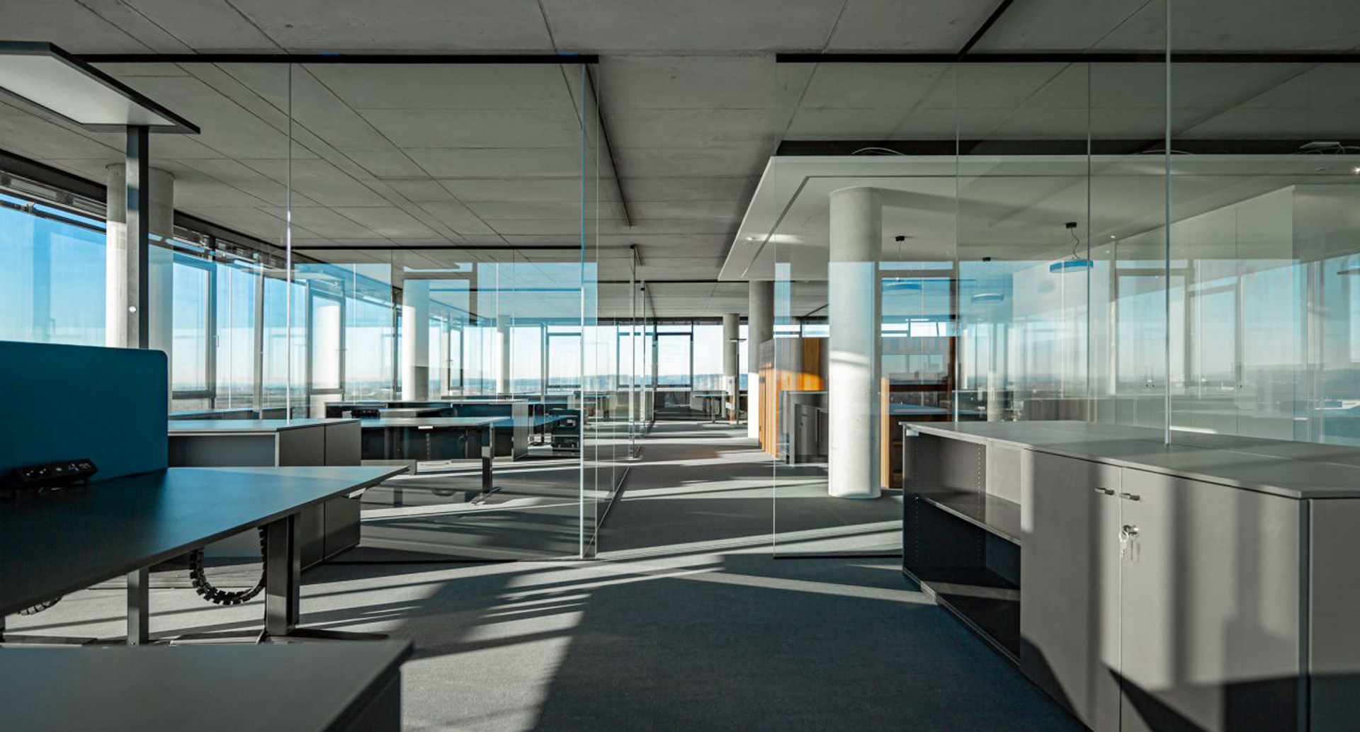 Transsolar developed the integrated comfort and energy concept and demonstrated its performance with the help of simulation calculations. The client is a well-known glass manufacturer and builds facades and roof structures. The glass envelope of the twelve-story office building is therefore an essential element of the concept. It provides weather protection without sacrificing comfort and ensures daylighting while remaining transparent. Visual and acoustic connection outside is possible and the solar shading system is housed in the double facade in a functionally reliable manner. Operable windows allow individual natural ventilation; decentralized ventilation components integrated into the facade ensure basic ventilation.