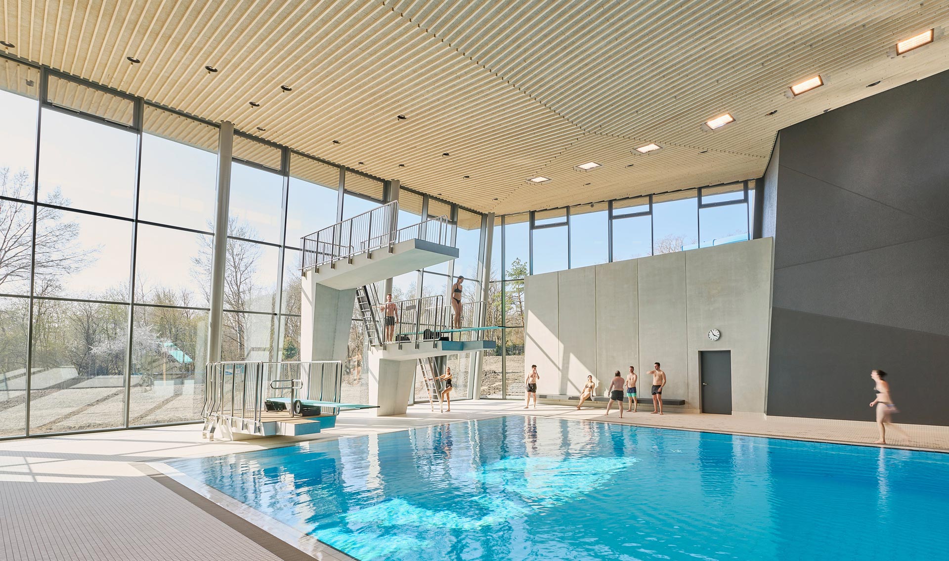 La façade extérieure de la piscine joue à merveille son rôle de barrière thermique mais est aussi transparente et ouverte de sorte que l'impression intérieure soit celle d'une salle de natation immergée dans un environnement naturel. Trois toitures végétalisées aux proportions finement équilibrées différencient le volume et divisent l'espace intérieur en zones de bains.