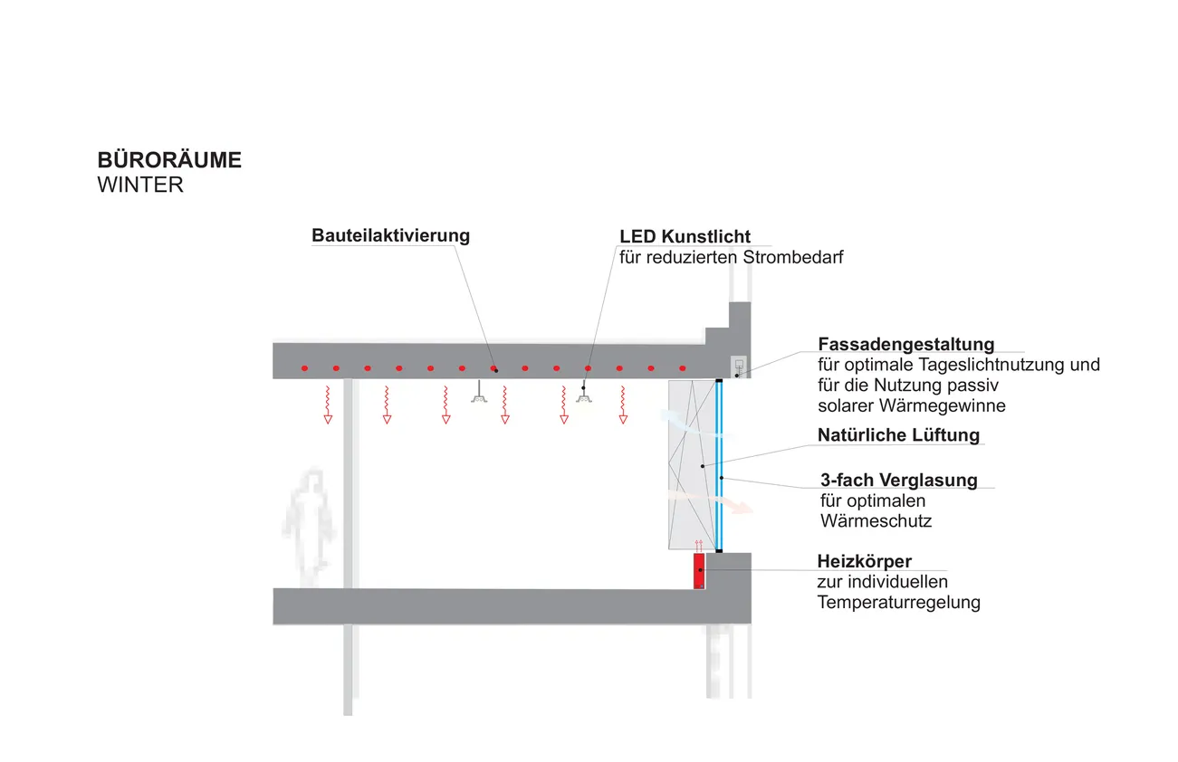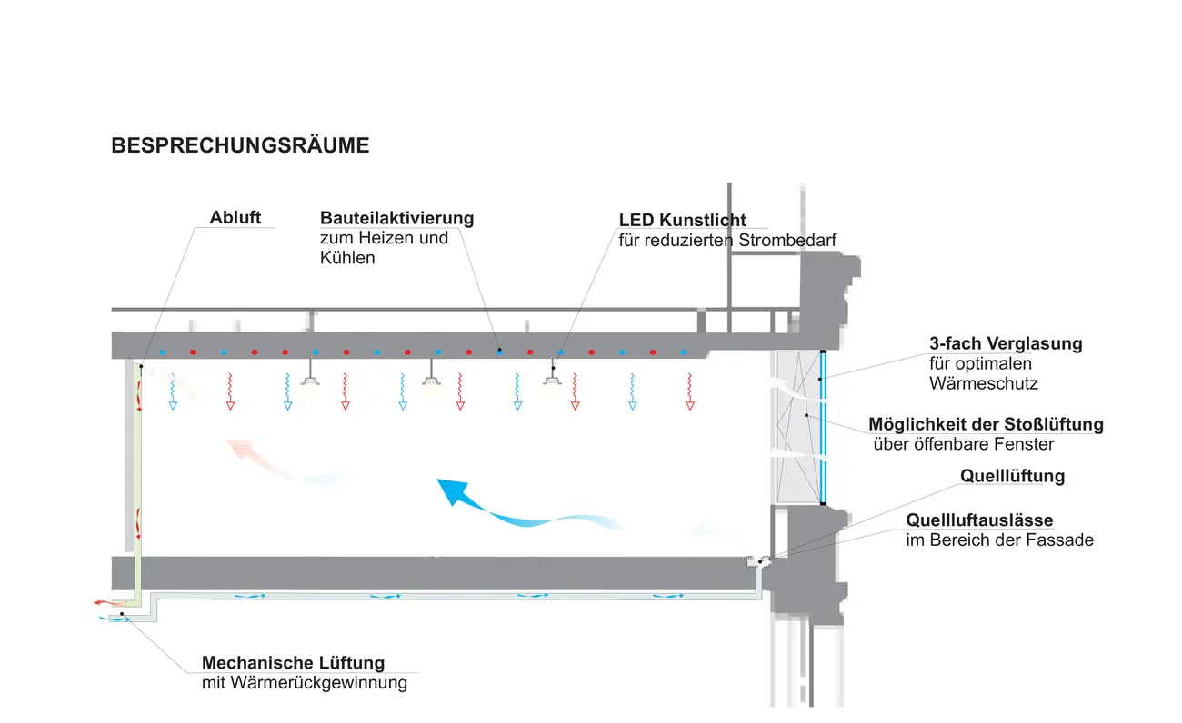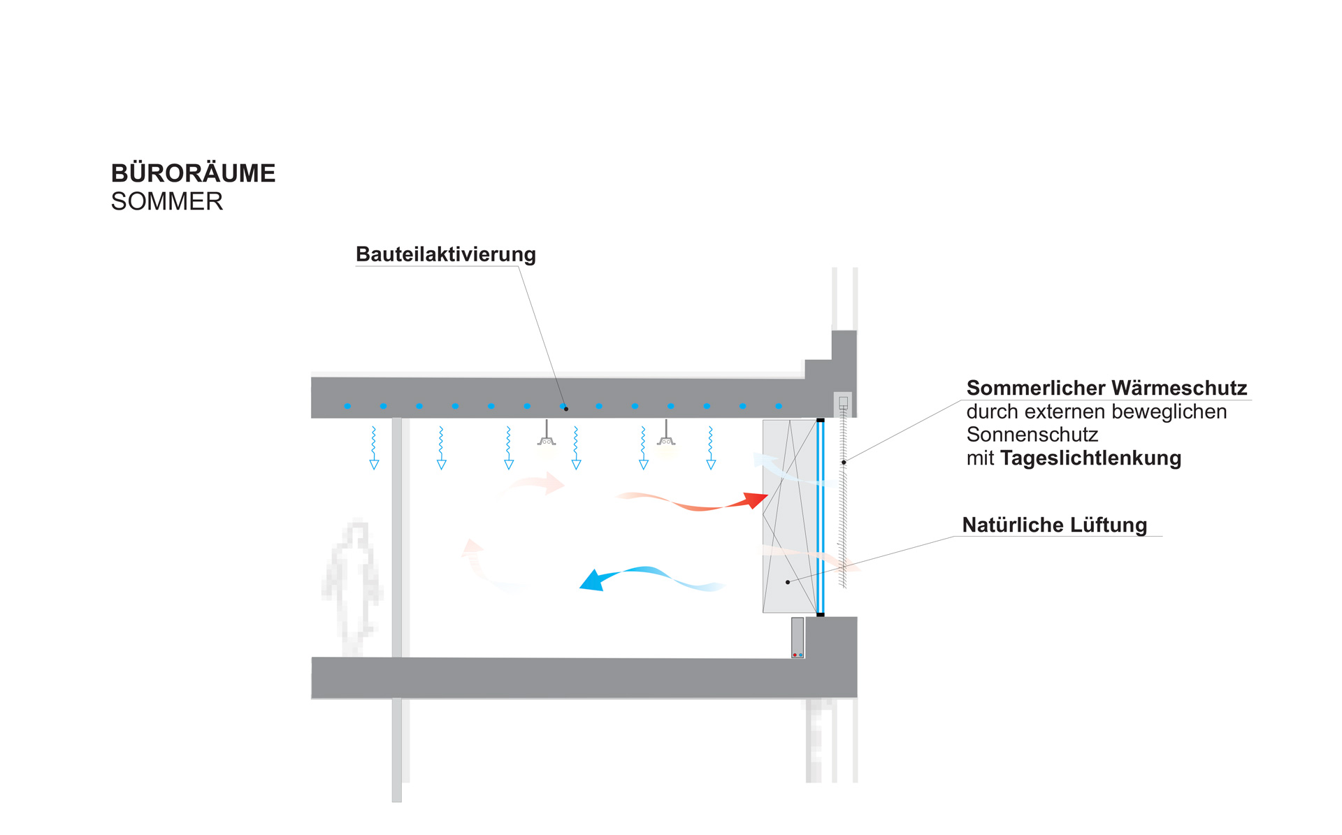 The façade concept reduces transmission heat losses. Solar gains and daylight availability are optimized wherever possible. During the summer, thermal insulation is ensured by external movable sun protection devices. In many areas, the building is naturally ventilated. Heating and cooling are mainly carried out via component activation, which forms the basis for a highly efficient heating and cooling supply.