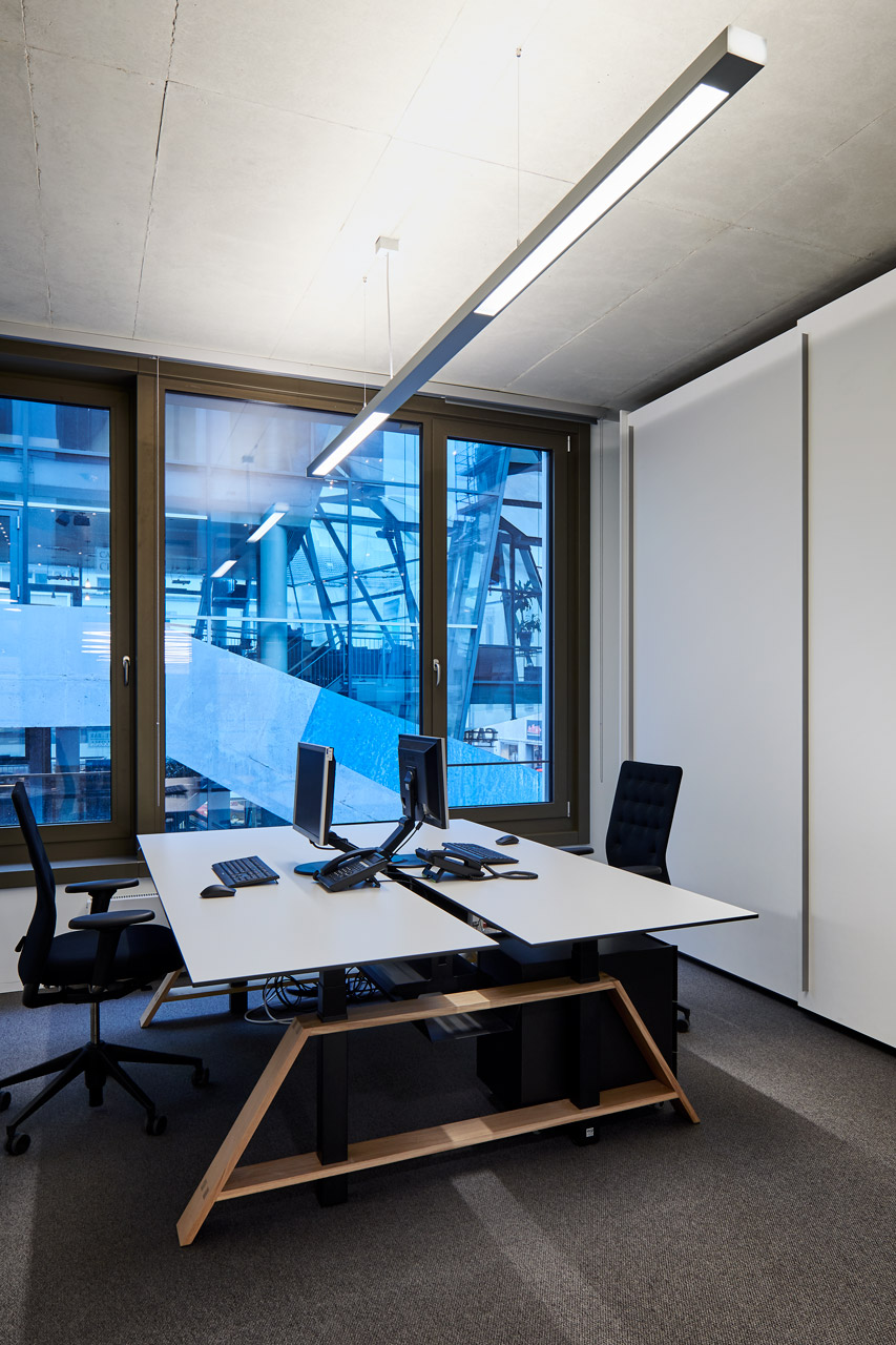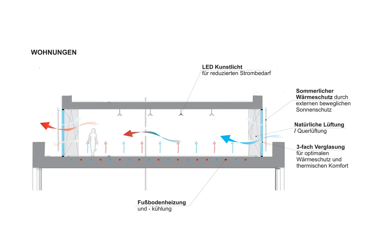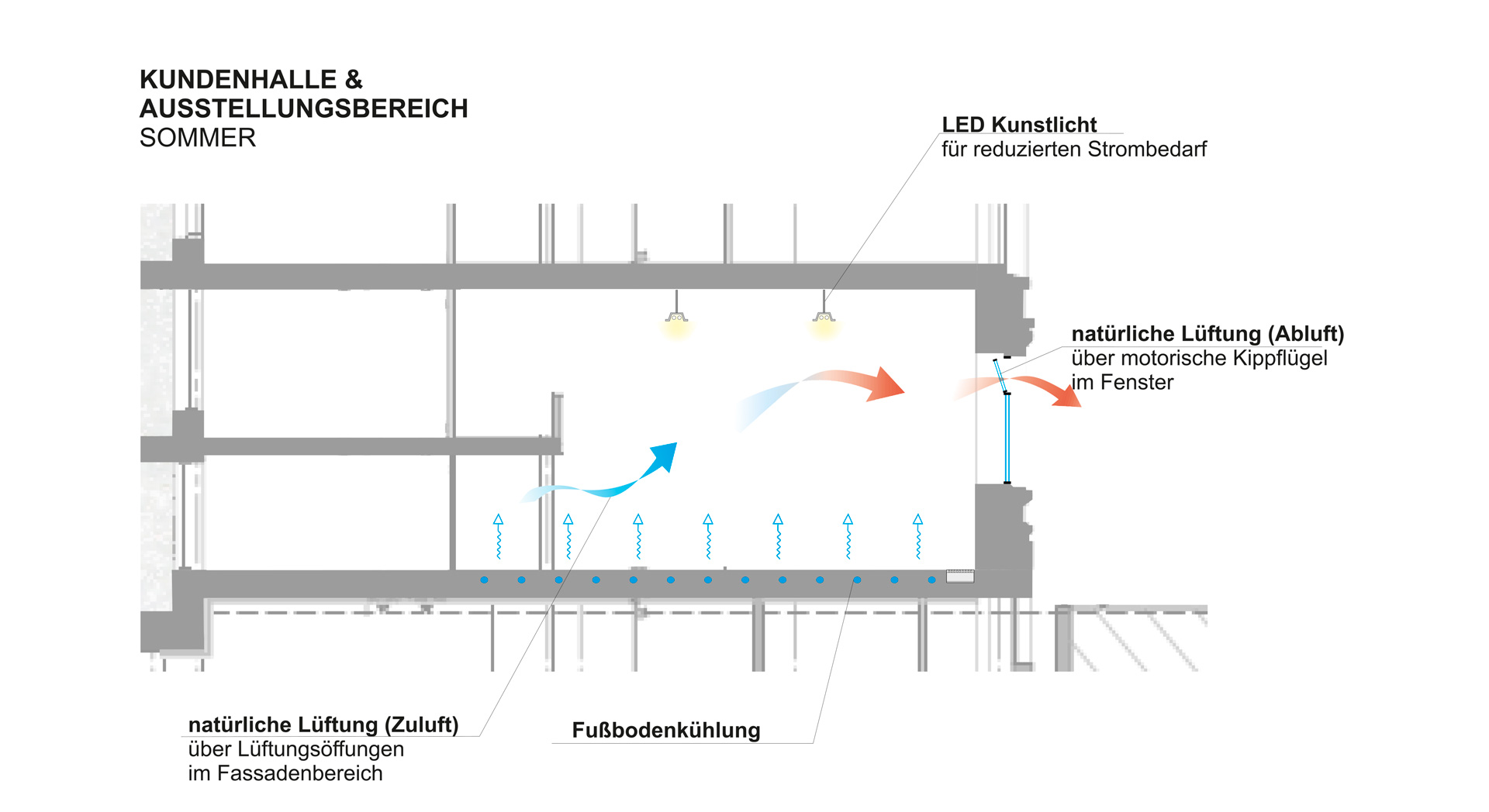 The façade concept reduces transmission heat losses. Solar gains and daylight availability are optimized wherever possible. During the summer, thermal insulation is ensured by external movable sun protection devices. In many areas, the building is naturally ventilated. Heating and cooling are mainly carried out via component activation, which forms the basis for a highly efficient heating and cooling supply.