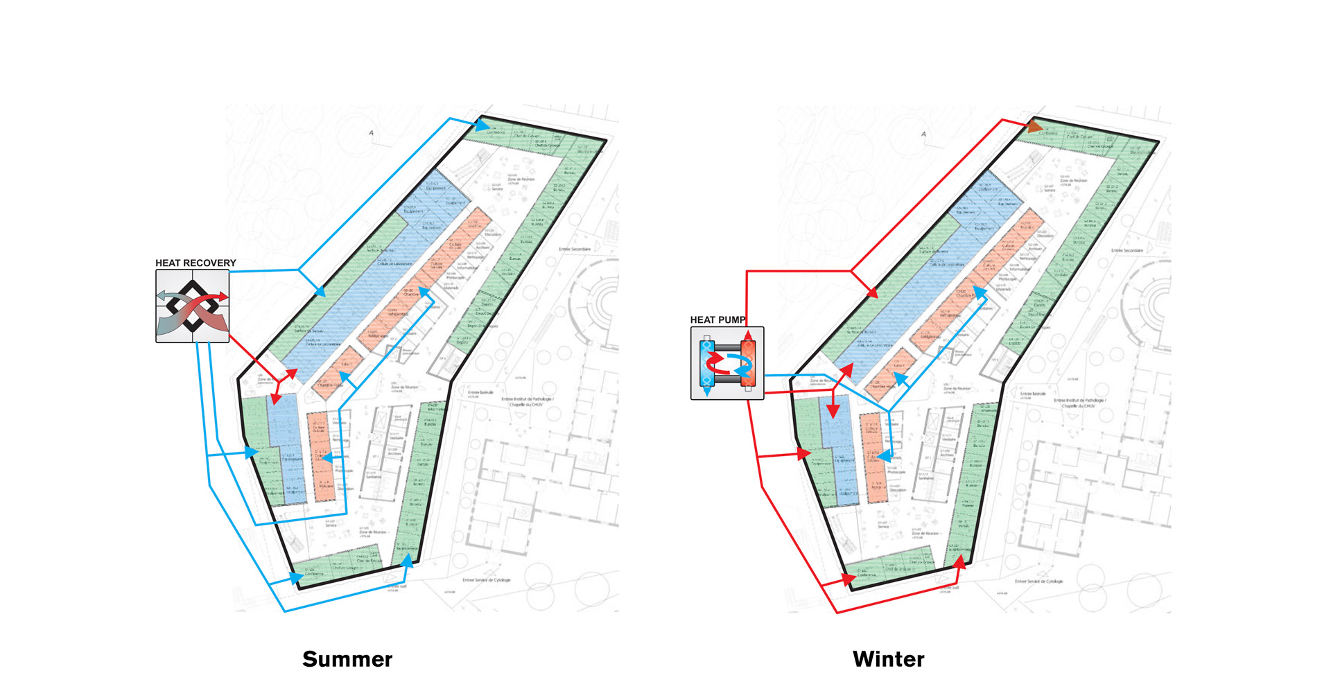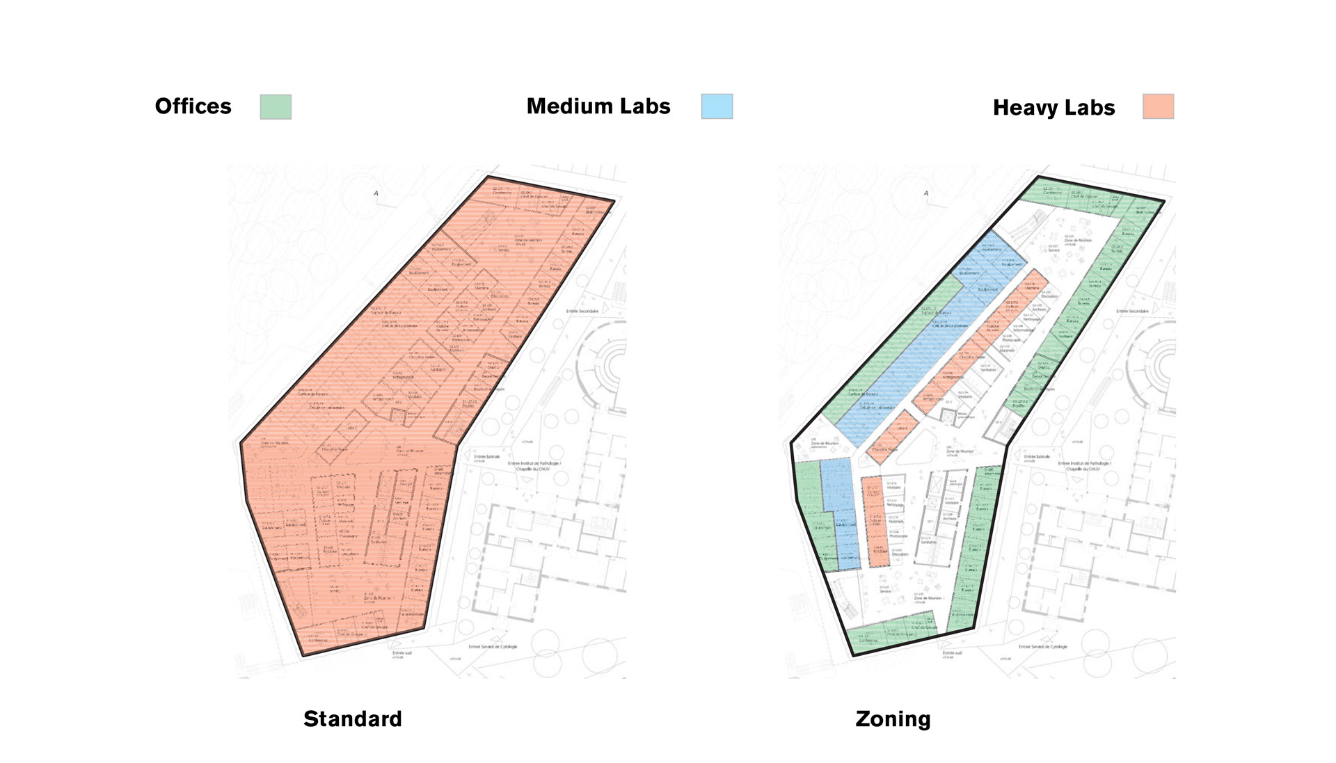 La ventilation hybride dans toutes les pièces (hors laboratoire) possédant un accès à la façade réduit le besoin en ventilation mécanique dans ces zones. Dans les laboratoires, la ventilation mécanique est réduite aux exigences hygiéniques de renouvellement d’air et contrôlée par des capteurs en CO2. Un système de pompe à chaleur réversible permet une récupération synergique de la chaleur des laboratoires vers les pièces hors laboratoire.