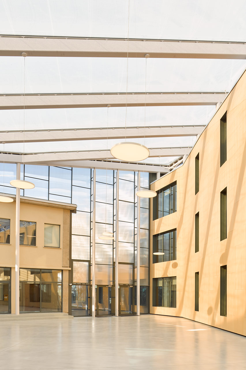 Des vitrages spéciaux et une protection anti-éblouissement interne complètent la protection contre un excès de soleil et de chaleur dans les pièces. La ventilation naturelle (ventilation hybride) de toutes les pièces non-laboratoires permet non seulement d’assurer l’apport hygiénique en air frais, mais également la ventilation nocturne des pièces. Dans toutes les pièces non-laboratoires, les plafonds massifs sont complètement apparents, afin de leur permettre d’absorber les charges thermiques.
