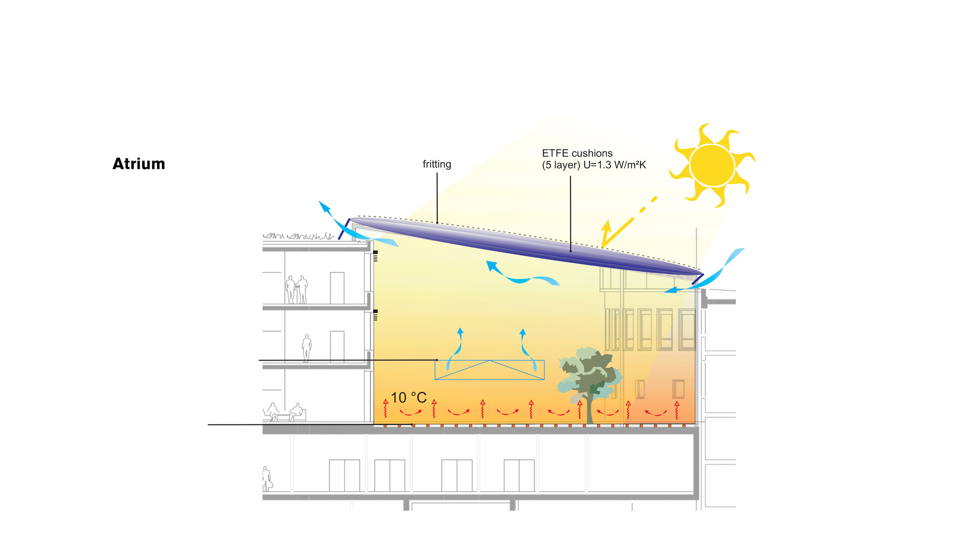 Le concept hybride traite les espaces différemment en fonction de leur utilisation. Dans les pièces (hors laboratoire), il est possible d'ouvrir les fenêtres pour ventiler de manière naturelle ; les laboratoires quant à eux sont alimentés en air uniquement de manière mécanique. Transsolar a également évalué de manière approfondie la rentabilité de plusieurs stratégies d'approvisionnement en énergie.
