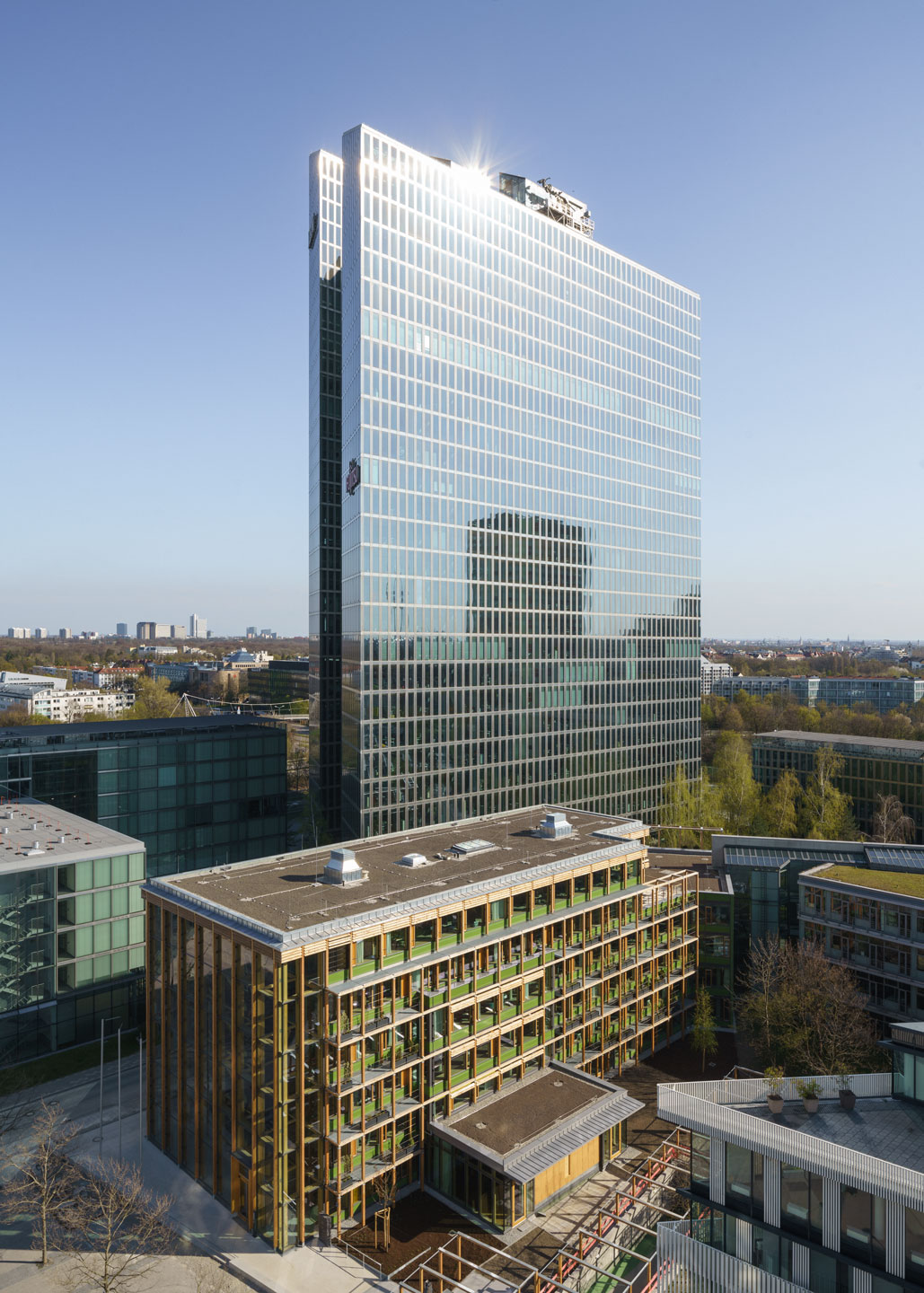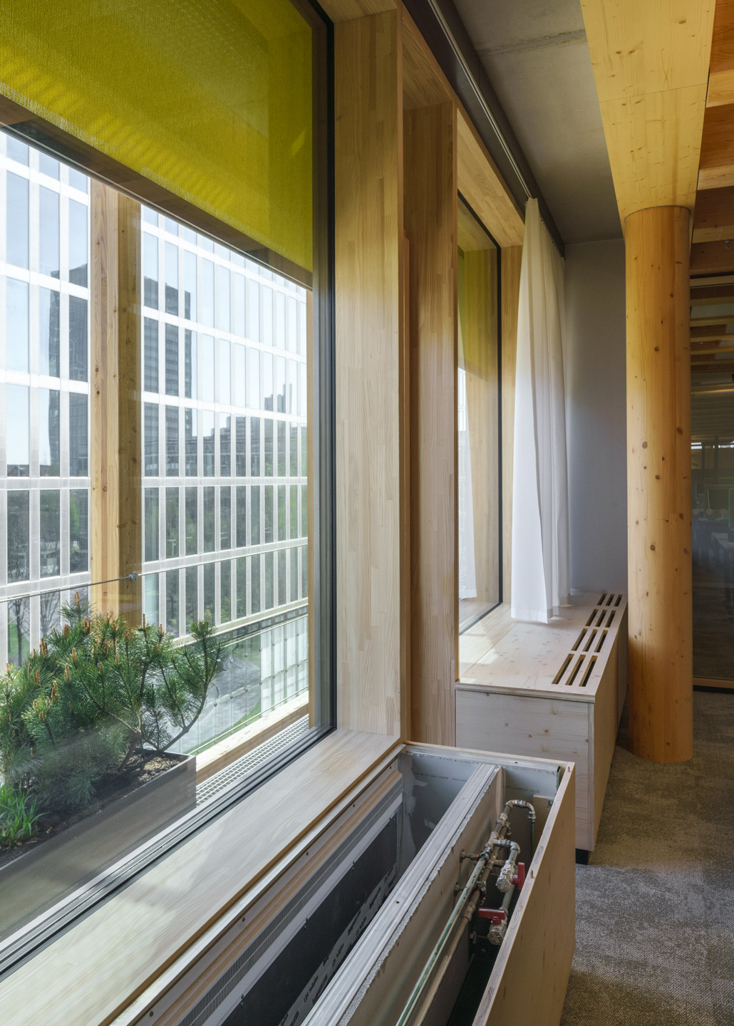 Le bois, le verre et la verdure caractérisent la nouvelle enveloppe du bâtiment. Les grandes surfaces vitrées des façades ne requirent pas de protection solaire extérieure dans de nombreuses parties, car l'ombrage des bâtiments environnants et de la verdure a été optimisée dans des simulations élaborées pour chaque fenêtre concernée.