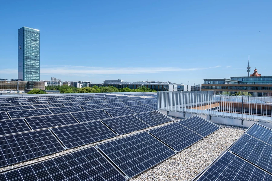 The new school building has a green roof and photovoltaic systems for regenerative power generation.