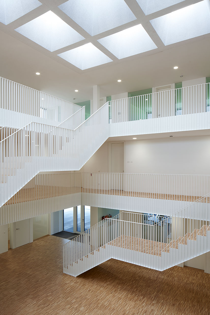Des laboratoires pour des test de durabilité, une cafétéria avec une kitchenette au rez-de-chaussée, des bureaux et une salle de séminaire. Un espace de réunion ouvert est situé dans l'atrium central. Celui-ci est très largement vitré par le biais de verrières, et s'étend du premier au troisième étage. Les verrières servent également de système d'évacuation de fumée et de chaleur, et peuvent également être utilisées pour la ventilation de l'atrium. L'air entre du rez-de-chaussée par une cassette à lamelles à commande électrique.