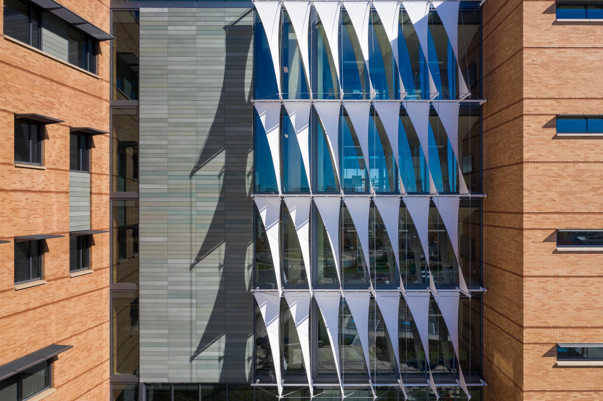 The new six-story Biomedical Sciences and Engineering Sciences building (BSE) is designed to offer advanced degree programs in cutting-edge technologies and medical sciences and to share teaching facilities across disciplines. The overall climate concept focused on optimizing access for daylight and natural ventilation for the majority of regularly used spaces. The south wing of the Biomedical Sciences and Engineering Building-which consists primarily of teaching labs, classrooms, and common study areas-is connected to an atrium to the north that houses faculty offices and computer labs.