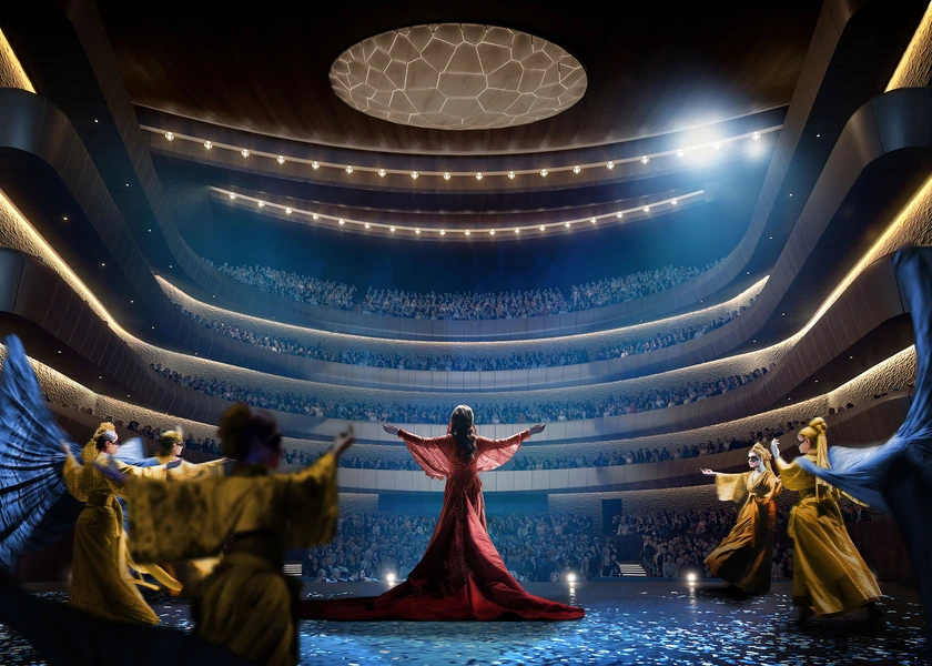 Les 46 000 m² de l’opéra pourront accueillir environ 3 500 personnes dans quatre espaces conçus pour divers types de spectacles. Au cœur du projet, un théâtre de 2 000 places pourra recevoir des productions de grande envergure, tandis qu’un théâtre polyvalent de 450 places accueillera des événements plus petits et des répétitions. Un amphithéâtre de 450 places en toiture, ombragé, permettra des performances en plein air, ajoutant une dimension unique à l’expérience. Ce projet inclura également un pavillon de services, un café et un espace de vente.