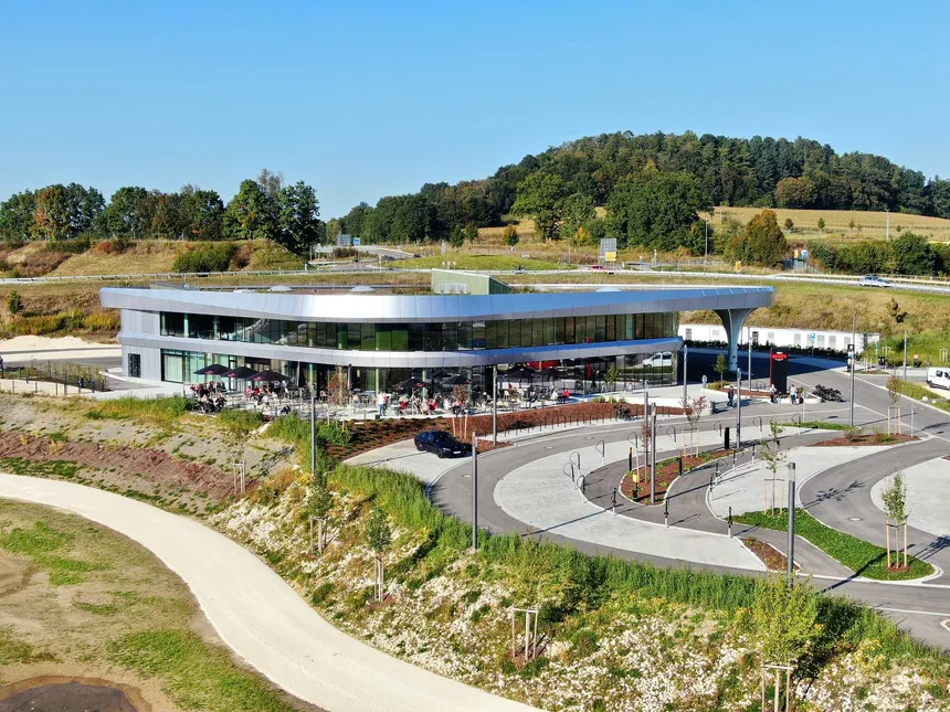 La plus grande station-service solaire du monde se trouve actuellement sur l'autoroute A8, à côté de de Zusmarshausen, en Bavière. Au terme de l'extension du parc d'innovation Sortimo, 120 bornes de charge normale (max. 60 kW) et 24 bornes de charge rapide (max. 350 kW) permettront de recharger quotidiennement jusqu'à 4000 véhicules électriques avec de l’électricité "verte". Afin d'utiliser intelligemment le temps d'attente, le campus offrira aux électromobilistes un café, des possibilités d'achat ainsi que des bureaux et des salles de conférence équipés de techniques de communication innovantes.