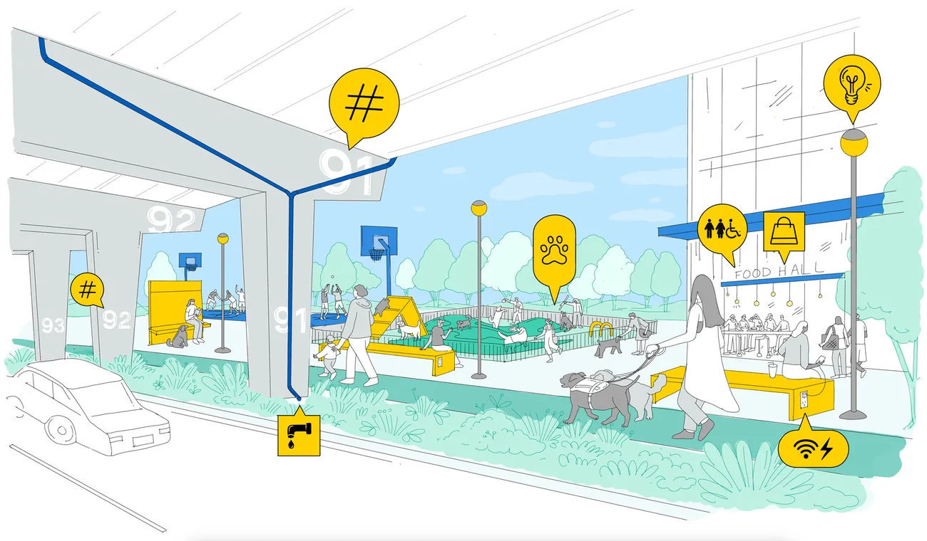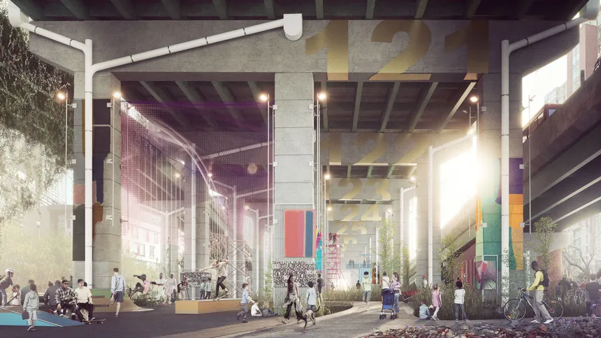 The Bentway Conservancy, a not-for-profit civic organization, is developing the Under Gardiner Public Realm Plan (PRP) to outline how the spaces under the Expressway can better serve the city. The supporting concrete columns for the expressway are called "bents" and their rows form a roughly 1.75 km long area, the "Bentway." Phase 1 of “The Bentway, Toronto’s Shared Space” opened in 2018 and is already a vital public space; backyard park, cultural platform, connector for the western Waterfront corridor and a demonstration of what’s possible under the Gardiner.